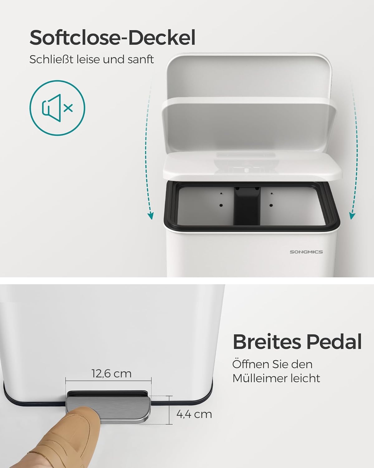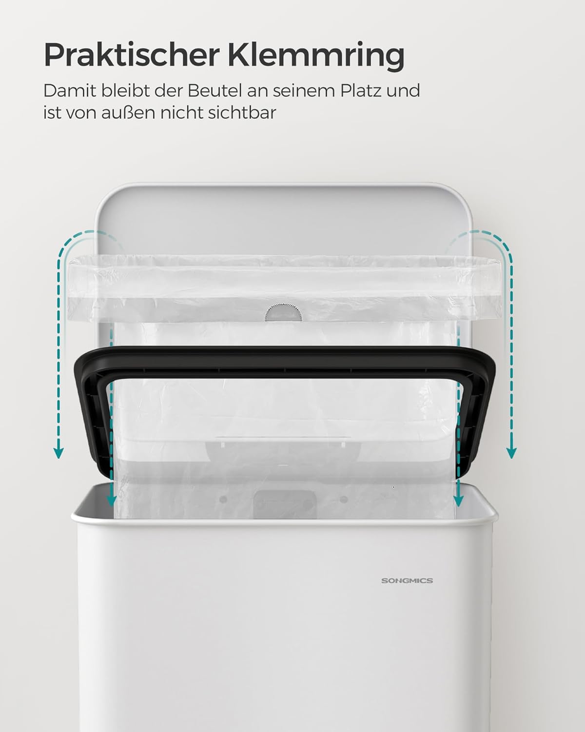 Großes 40‑Liter‑Fassungsvermögen für viel Abfall, Softclose‑Deckel schließt leise und sanft, Klemmring fixiert Müllbeutel und schafft 20% mehr Innenraum