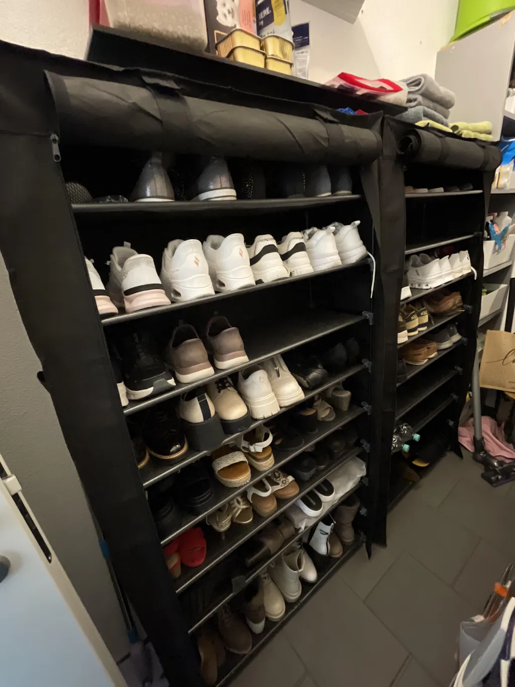 Platz für 40–50 Paar Schuhe, flexible abnehmbare Ablagen für verschiedene Schuhhöhen, staubdichter Überzug schützt vor Schmutz und Feuchtigkeit