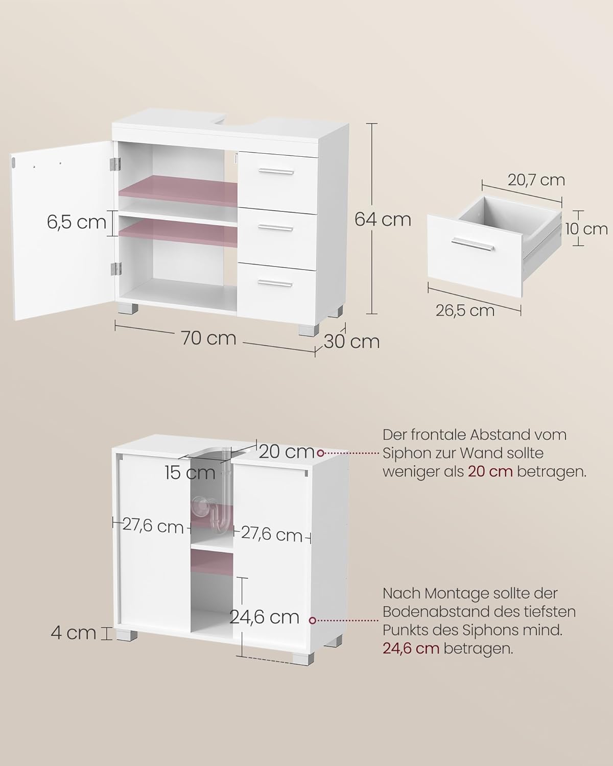 Entdecken Sie den SONGMICS Waschbeckenunterschrank – die perfekte Lösung für Ihr Badezimmer! Mit seinen kompakten Abmessungen von 30 x 70 x 64 cm bietet dieser stilvolle Badschrank nicht nur ein modernes Design in wolkenweiss, sondern auch jede Menge Stauraum. Dank der drei grosszügigen Schubladen und zwei Fächern hinter der Tür haben Sie ausreichend Platz, um all Ihre Badeutensilien, Handtücher und mehr ordentlich zu verstauen. Die höhenverstellbare Ablage ermöglicht es Ihnen, unterschiedlich grosse Flaschen von Shampoo bis Duschgel problemlos unterzubringen. Die praktischen Griffe sorgen dafür, dass sich die Schubladen und die Schranktür mühelos öffnen lassen. Hergestellt aus hochwertigen MDF / Spanplatte-Platten, ist dieser Badezimmerschrank robust und langlebig – ein Möbelstück, das Ihnen über viele Jahre hinweg treue Dienste leisten wird. Zusätzlich sorgen die beiliegenden Kippschutzteile für mehr Stabilität, sodass Sie sich keine Sorgen um die Sicherheit machen müssen. Der Aufbau gestaltet sich dank der gekennzeichneten Einzelteile und der verständlichen, bebilderten Anleitung kinderleicht. Bitte beachten Sie die Abmessungen des Schranks sowie den Ausschnitt für den Siphon, um sicherzustellen, dass der Unterschrank optimal passt. Beachten Sie, dass er nicht für Waschbecken mit Beckensäule geeignet ist. Verleihen Sie Ihrem Badezimmer mit dem SONGMICS Waschbeckenunterschrank einen Hauch von Eleganz und Funktionalität!
