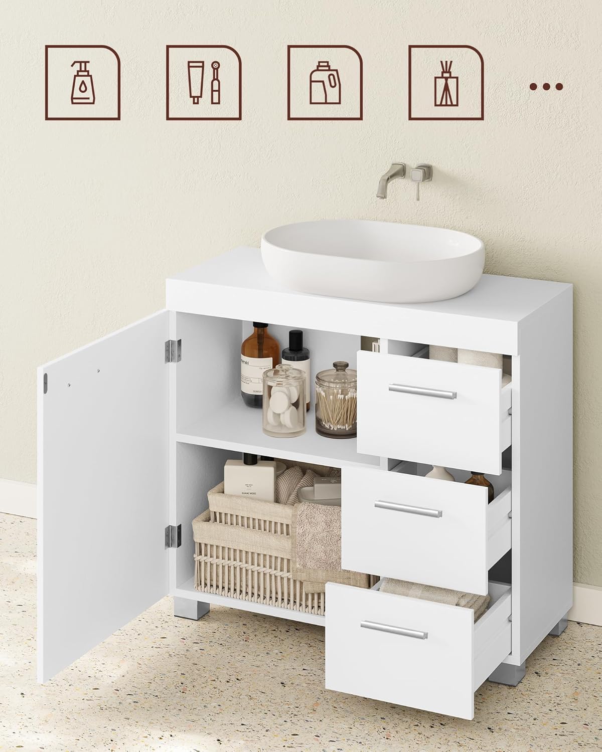 Kunden sind begeistert von dem modernen, wolkenweißen Design und dem großzügigen Stauraum des SONGMICS Waschbeckenunterschranks. Besonders geliebt werden die drei Schubladen, die höhenverstellbare Ablage für Flaschen, die praktische Tür mit Fächern, die leichtgängigen Griffe, die robuste MDF/Spanplatte sowie die einfache Montage und die Kippschutzteile für mehr Sicherheit.