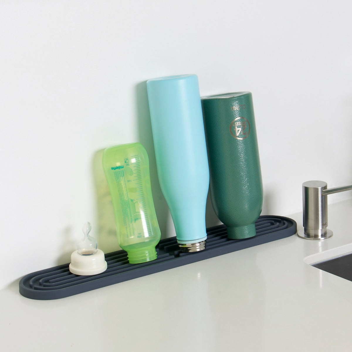 Die platzsparende Abtropfmatte und Barmatte. Spülmaschinenfestes und antibakterielles Abtropfgestell für Karaffen, Flaschen, Babyfläschchen, Weingläser, Schneidbretter, Kochlöffel oder andere Utensilien der Küche. Dri.pad ist eine Küchenmatte aus hochwertigem Platin-Silikon. Weich und sanft zu Ihren Gläsern und der Arbeitsplatte. Antibakteriell, und hitzebeständig bis 220 Grad C. In den Massen angelehnt an die klassische Barmatte: 43 cm x 7.8 cm. Dri.pad ist z.B. auch ein Abtropfhalter passend für Sodastream, Emil, Crystal oder andere Flaschen.