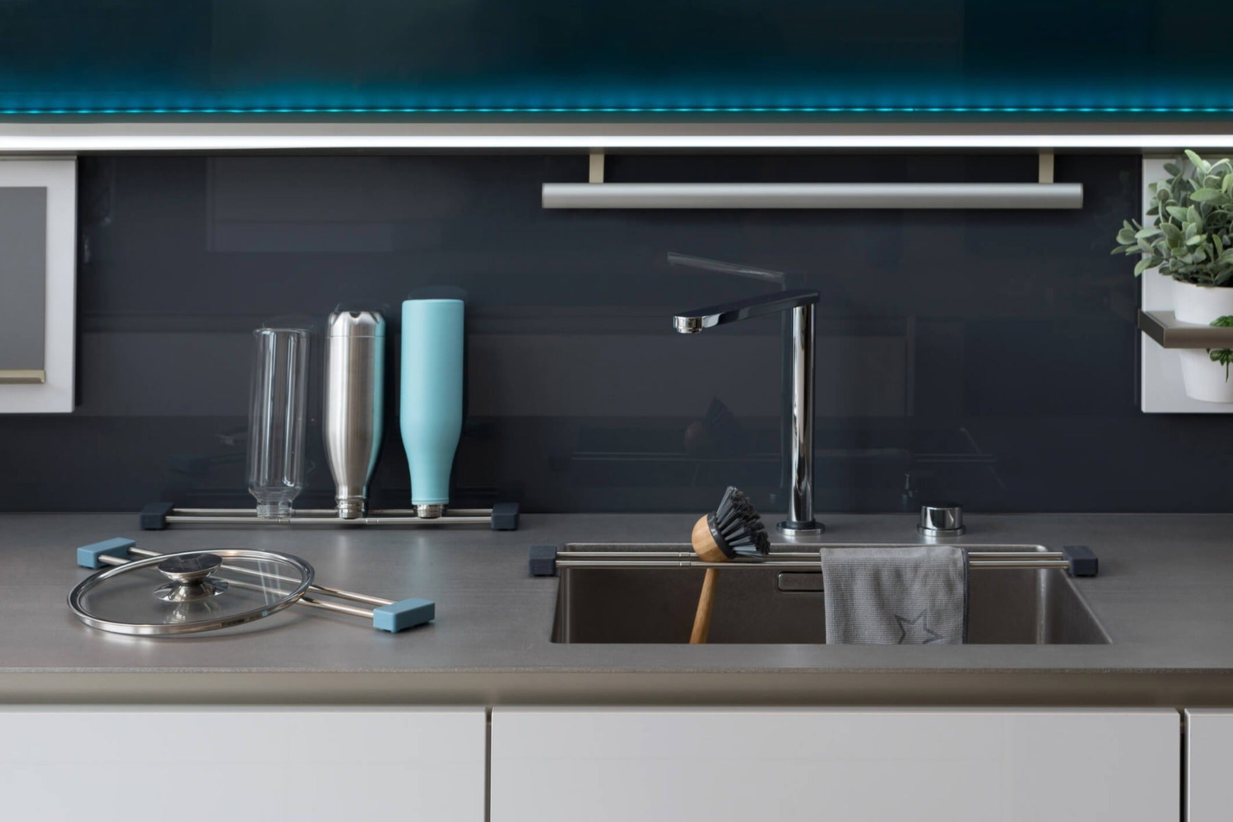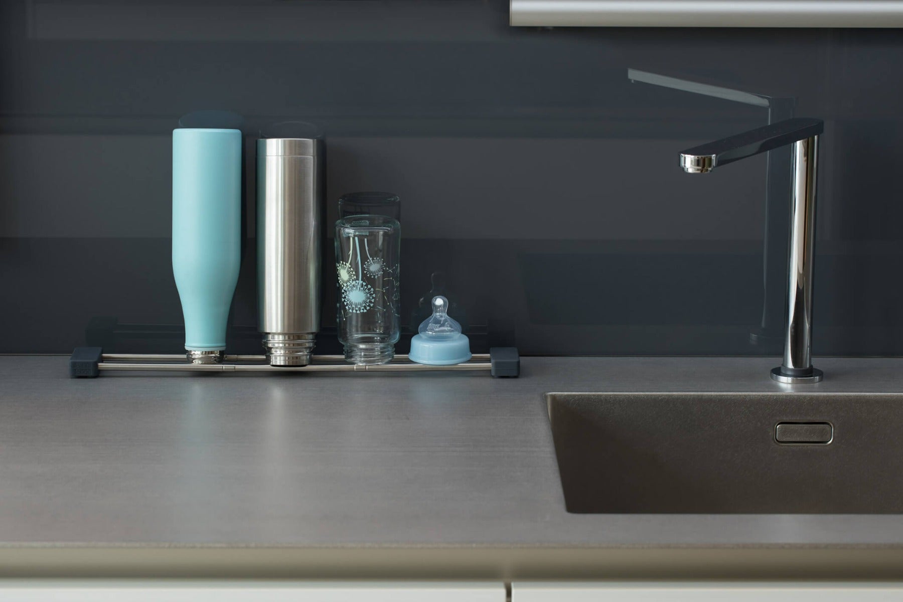 Auch ausserhalb der Spüle ist drip.line ein platzsparendes Multitalent: Zum schrägen Abtropfen von Trinkflaschen oder im 2-er Set als praktischer Untersetzer für grosse Backbleche. Auf das Minimal-Mass verkleinert, passt drip.line in jede Küchenlade.