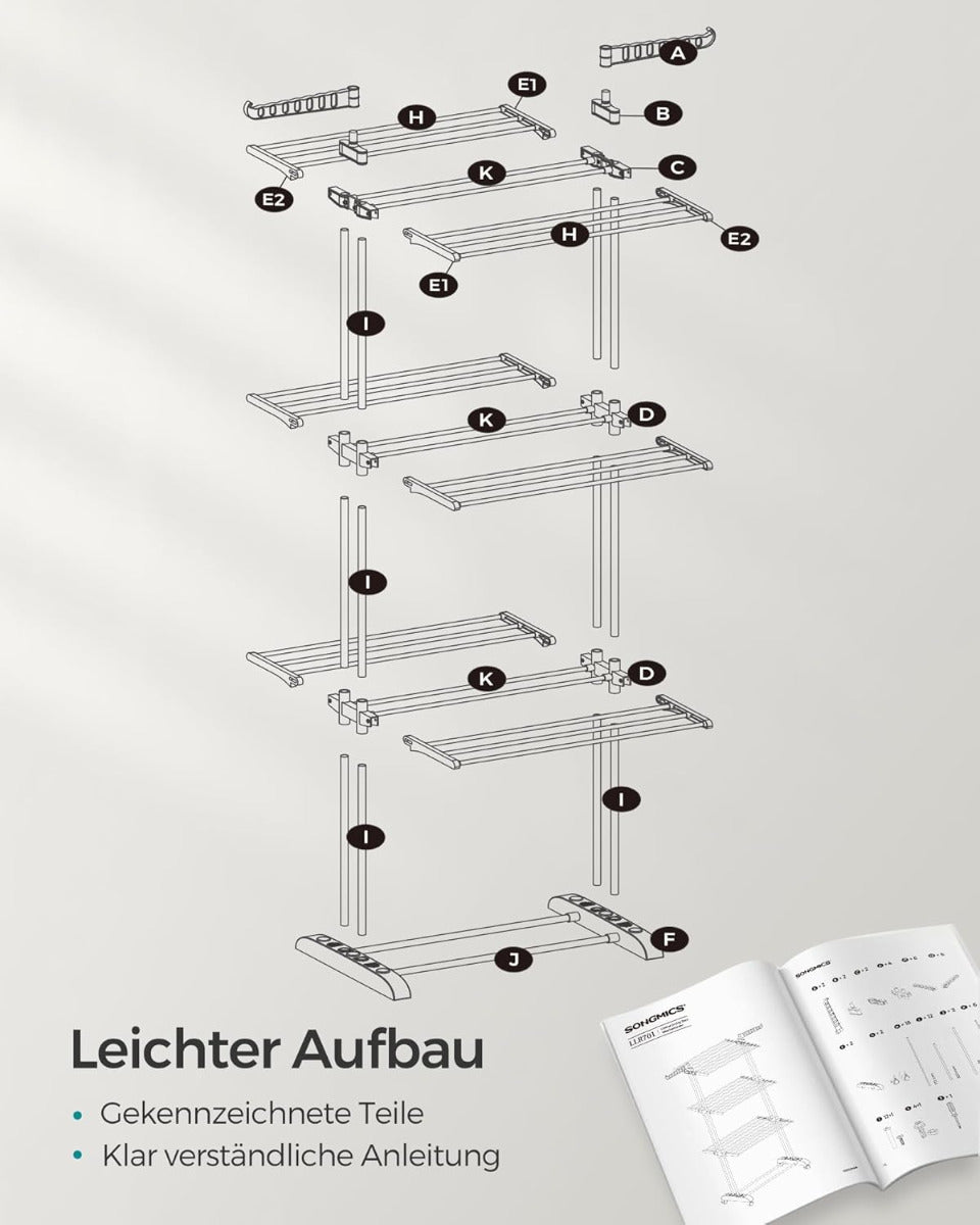 Kunden schätzen besonders die Vielseitigkeit des SONGMICS Wäscheständers mit 4 Ebenen. Seine klappbaren Trockenflächen und die Möglichkeit, ihn platzsparend zusammenzuklappen, begeistern viele. Die hohe Belastbarkeit von bis zu 35 kg und die robusten Materialien sorgen für Stabilität und Langlebigkeit. Zudem erleichtern die Rollen den Transport, während die drehbaren Haken ideal für Kleiderbügel sind. Der Wäscheständer passt perfekt in jeden Wohnraum und erleichtert das Trocknen von Wäsche.