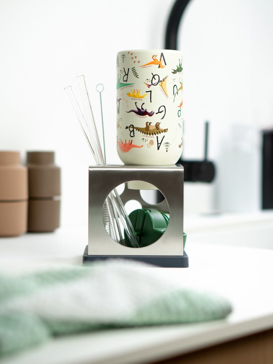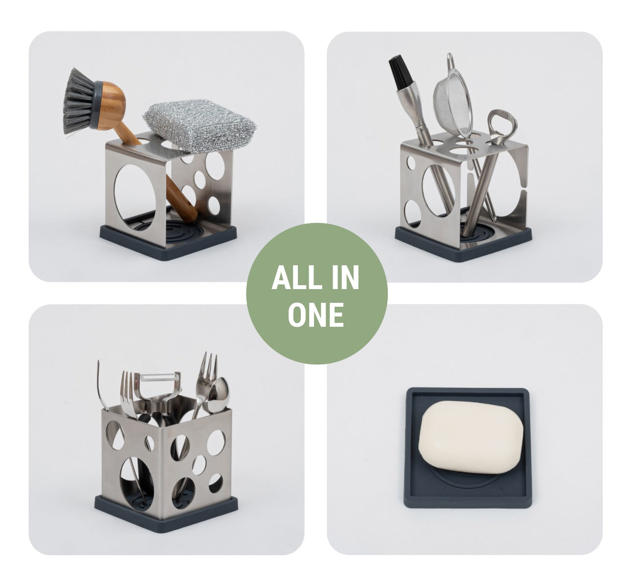 6 in one: Der «Wunder-Würfel» ist nicht nur ein edles Design-Element in Küche oder Bad, er hält auch mindestens 6 Abtropf-Funktionen für Sie bereit. Und das bei minimalistischen Massen von 11 mal 11 mal 10 cm. Durch 3 verschiedene Flaschenauslässe kompatibel mit fast allen Flaschen, Thermos-Flaschen, Thermo-Behältnissen, Glasflaschen oder Metallflaschen. Auch als Organizer und Abtropf-Vorrichtung für Kochlöffel, Pizzaschneider, Knoblauchpresse, Silikonpinsel und vieles mehr verwendbar – die Möglichleiten sind fast unendlich, obwohl Grösse und Design minimalistisch konzipiert sind. Hochwertig verarbeitet aus Edelstahl (18/8) mit einer Auffang-Matte aus lebensmittelechtem Platin-Silikon. Hitzebeständig bis 220 Grad C. Alle Teile waschbar im Geschirrspüler oder von Hand mit Seife und Spülmittel. Geschütztes Schweizer Design von Georg Fontana, ein puristisches Schmuckstück für den ganzen Haushalt, sehr flexibel, sogar als Stifte-Halter geeignet.