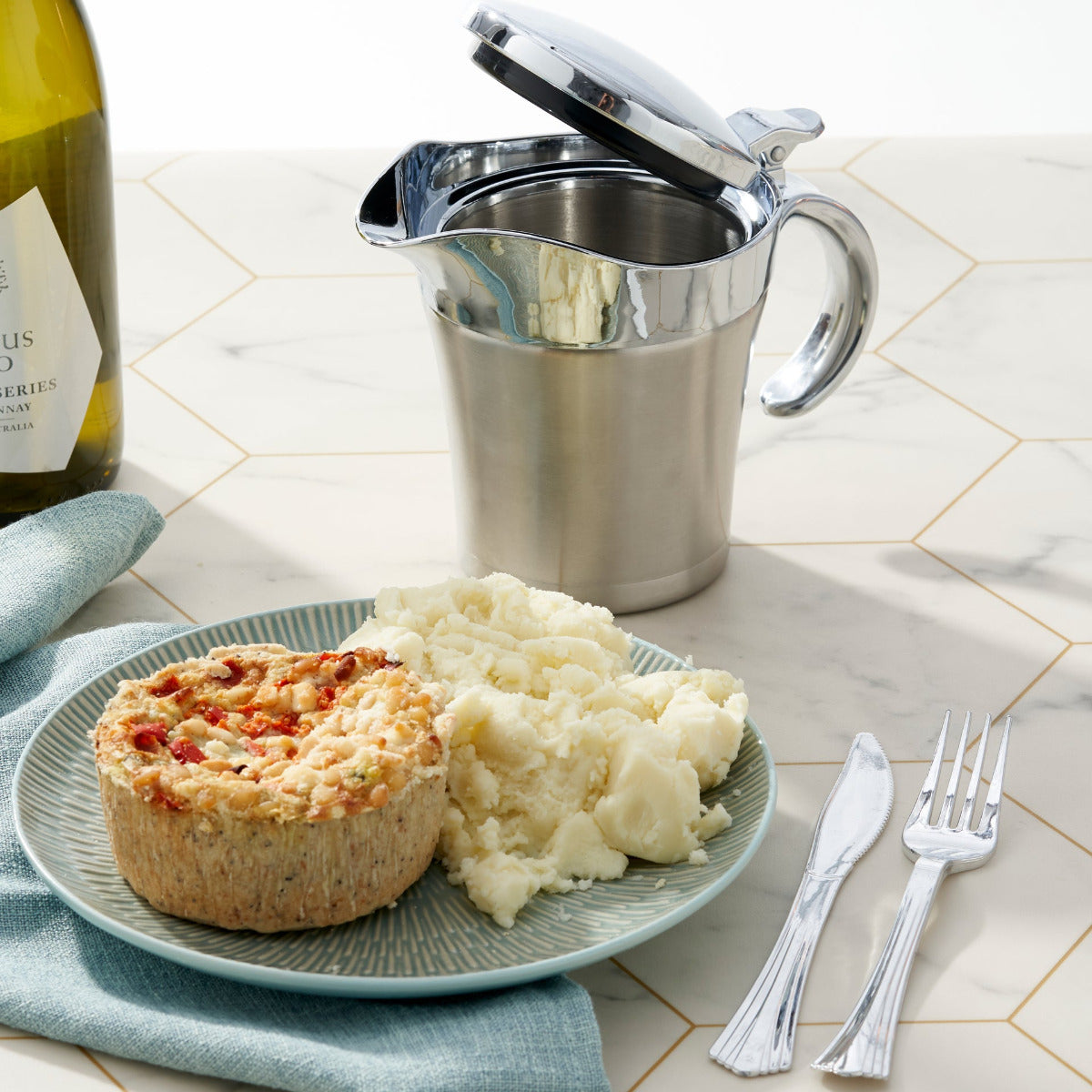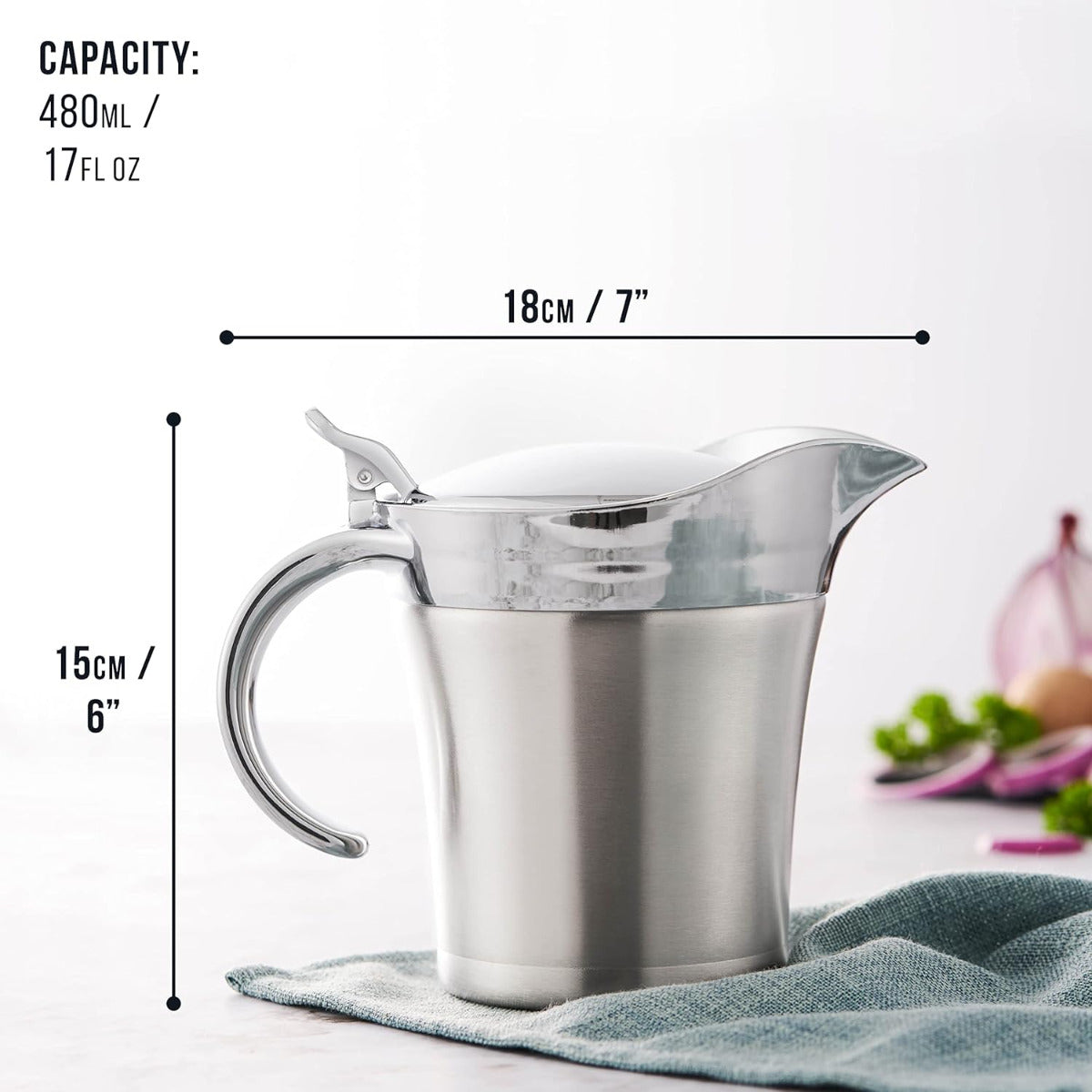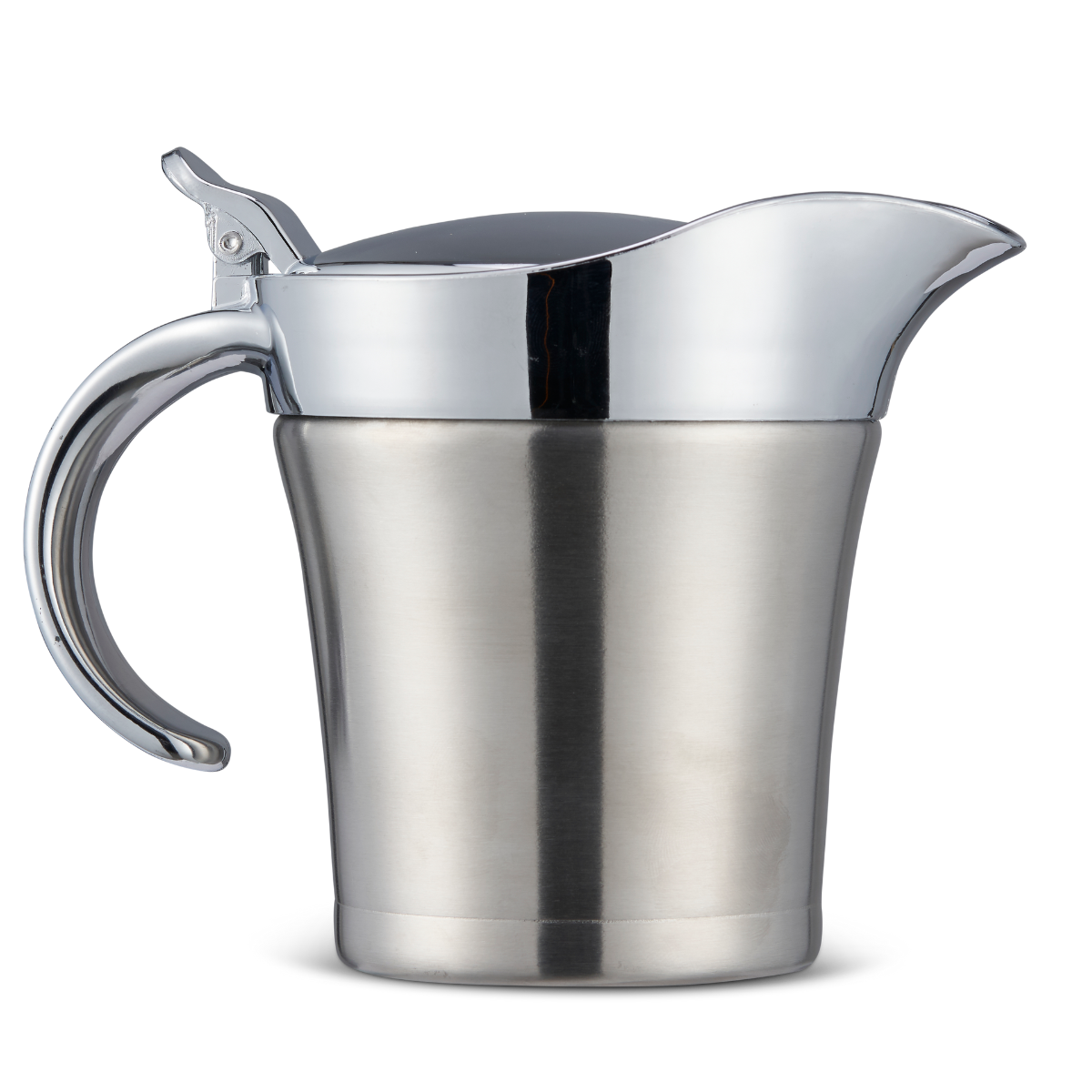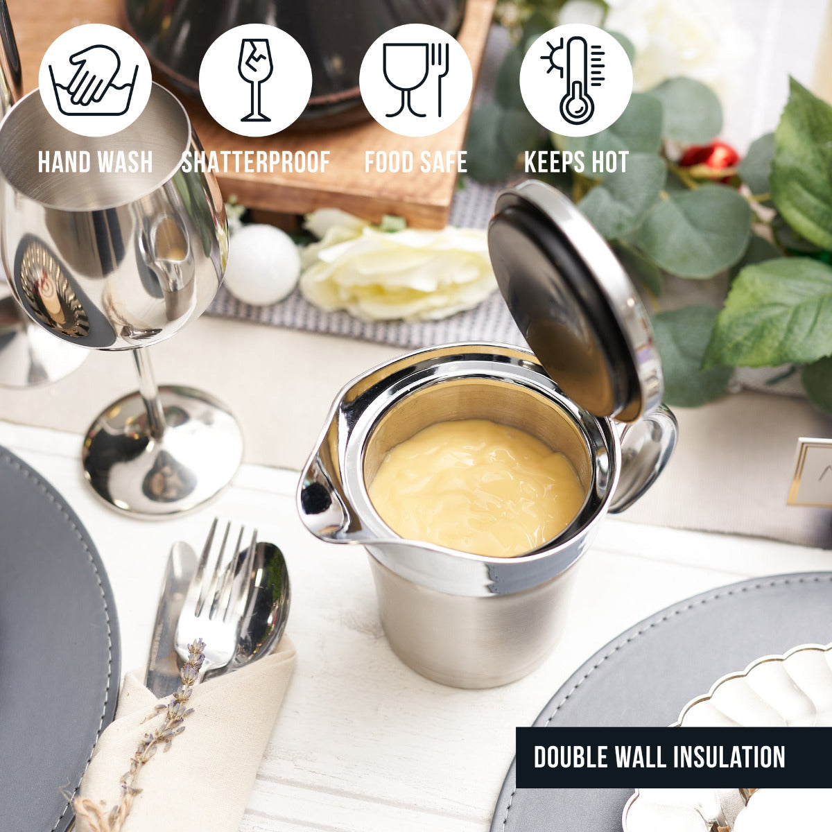 Saucierkanne Edelstahl – Perfekte Temperatur, stilvolles und tropffreies Servieren Mit der doppelwandigen Saucierkanne aus Edelstahl bringst du Stil und Funktionalität auf den Tisch. Dank ihrer isolierten Konstruktion bleiben Saucen, Dressings oder andere Flüssigkeiten länger auf optimaler Temperatur – sei es eine heisse Bratensauce zum Sonntagsbraten oder eine gekühlte Vanillesauce für dein Dessert. Das schlanke, moderne Design macht sie nicht nur zu einem praktischen Küchenhelfer, sondern auch zu einem eleganten Hingucker auf jeder Tafel. Die speziell entwickelte Ausgusstülle ermöglicht ein sauberes, tropffreies Einschenken und sorgt für eine kontrollierte Dosierung. Die Kanne liegt angenehm in der Hand und ist durch ihr leichtes, aber robustes Edelstahlgehäuse besonders langlebig. Die doppelwandige Isolierung reduziert zudem das Risiko von Hitzeübertragung, sodass du die Kanne bequem anfassen kannst, ohne dich zu verbrennen. Mit einem Fassungsvermögen von 500 ml, das ideal für Mahlzeiten mit Familie und Gästen ist, überzeugt diese Saucierkanne sowohl in der heimischen Küche als auch im professionellen Gastronomiebereich. Sie lässt sich leicht reinigen und ist eine langlebige Alternative zu herkömmlichen Servierkannen. Perfekt für jede Gelegenheit – ob festliches Dinner oder gemütliches Essen mit der Familie! Infos zu diesem Artikel: ✔ Doppelwandige Isolierung – Hält Saucen länger warm oder kalt✔ Tropffreier Ausguss – Sauberes und kontrolliertes Einschenken✔ Hochwertiger Edelstahl – Langlebig, rostfrei und stilvoll✔ Ergonomisches Design – Leichtes und komfortables Handling✔ Ideal für warme & kalte Saucen – Perfekt für Bratensaucen, Vanillesaucen & Dressings✔ Einfache Reinigung – Pflegeleicht und hygienisch