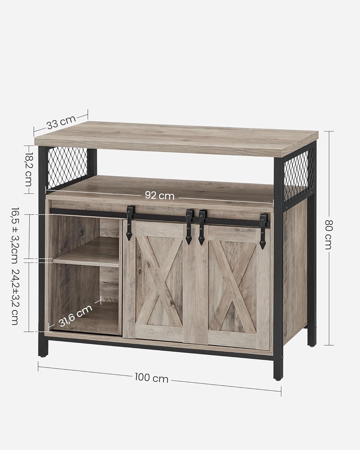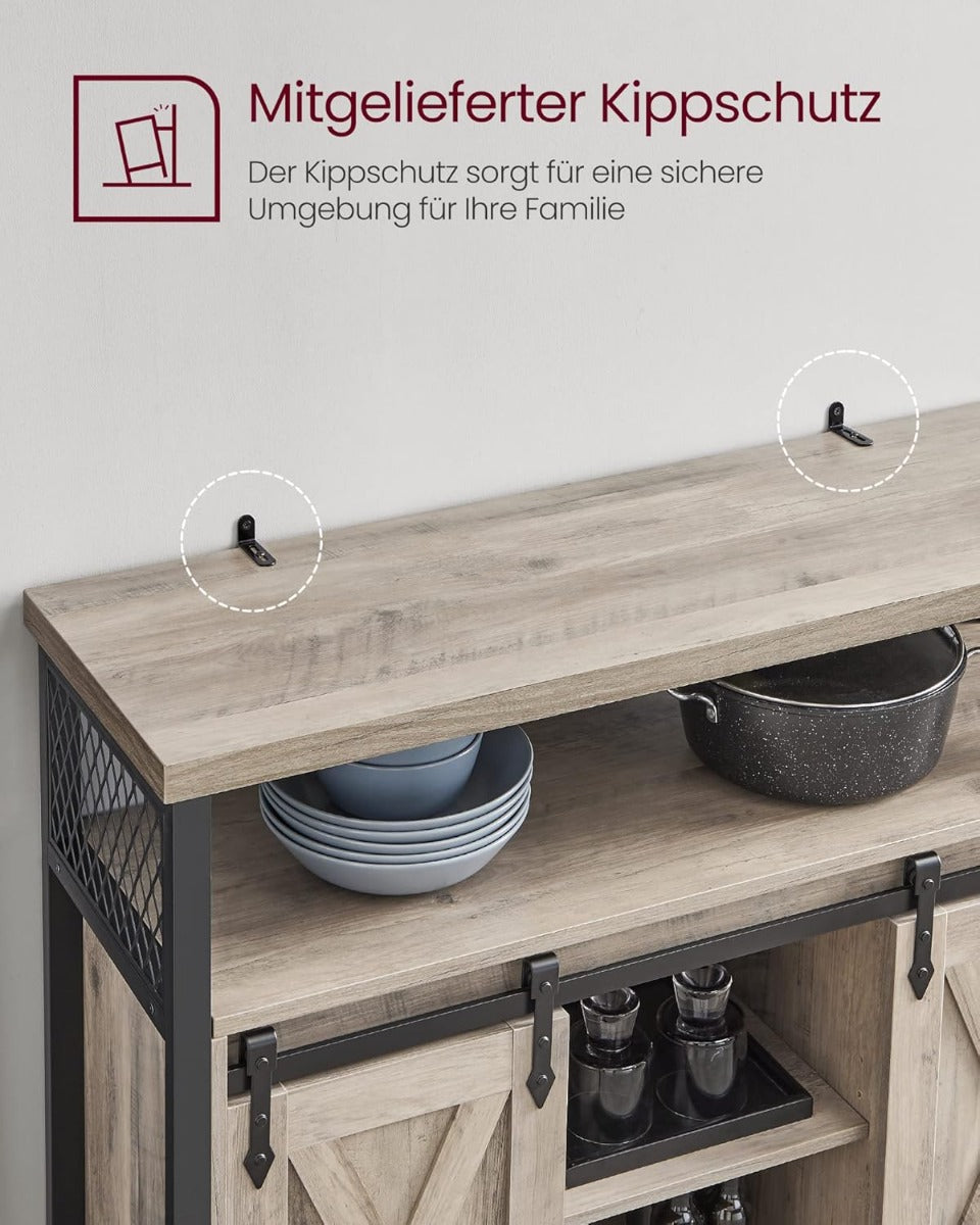 Das VASAGLE Sideboard LSC092B02 in elegantem Greige-Schwarz verbindet zeitlosen Landhausstil mit durchdachter Funktionalität und hochwertiger Verarbeitung: Mit den Massen 100 x 33 x 80 cm (L x B x H) bietet die stabile Tischplatte von 33 x 100 cm grosszügigen Platz für Dekoration, Küchenutensilien oder Elektronik, das Gesamtgewicht beträgt 24,7 kg. Zwei symmetrisch angeordnete Schiebetüren verleihen dem Küchenschrank eine elegante Optik und ermöglichen zugleich einfachen Zugriff auf den Innenraum, der durch sechs Fächer und drei dreifach höhenverstellbare sowie herausnehmbare Ablagen flexibel an verschiedene Aufbewahrungsbedürfnisse anpassbar ist. Jede Ablage und die Oberseite sind mit einer maximalen statischen Belastbarkeit von 15 kg belastbar, sodass Gläser, Schüsseln, Bücher oder Akten sicher untergebracht werden können. Die Kombination aus robusten Holzspanplatten und einem hochwertigen Metallgestell sorgt für hohe Stabilität und Langlebigkeit, verstellbare Füsse gleichen unebene Böden aus und der mitgelieferte Kippschutz garantiert zusätzliche Sicherheit. Dieses vielseitige Möbelstück eignet sich ideal als Sideboard in der Küche, als Flurschrank für Schlüssel und Kleinteile, als TV-Schrank im Wohnzimmer oder als praktischer Aktenschrank im Homeoffice. Die Montage ist dank klarer Anleitung, gekennzeichneter Teile und mitgelieferter Ersatzschrauben einfach und schnell zu bewerkstelligen; im Paket enthalten sind 1 x Aufbewahrungsschrank, 1 x Zubehörpaket, 1 x Kippschutz und 1 x Anleitung. Mit seinem unaufdringlichen Greige-Schwarz-Finish fügt sich das Sideboard harmonisch in viele Einrichtungsstile ein und bietet eine attraktive, platzsparende Lösung für geordnete und stilvolle Aufbewahrung.