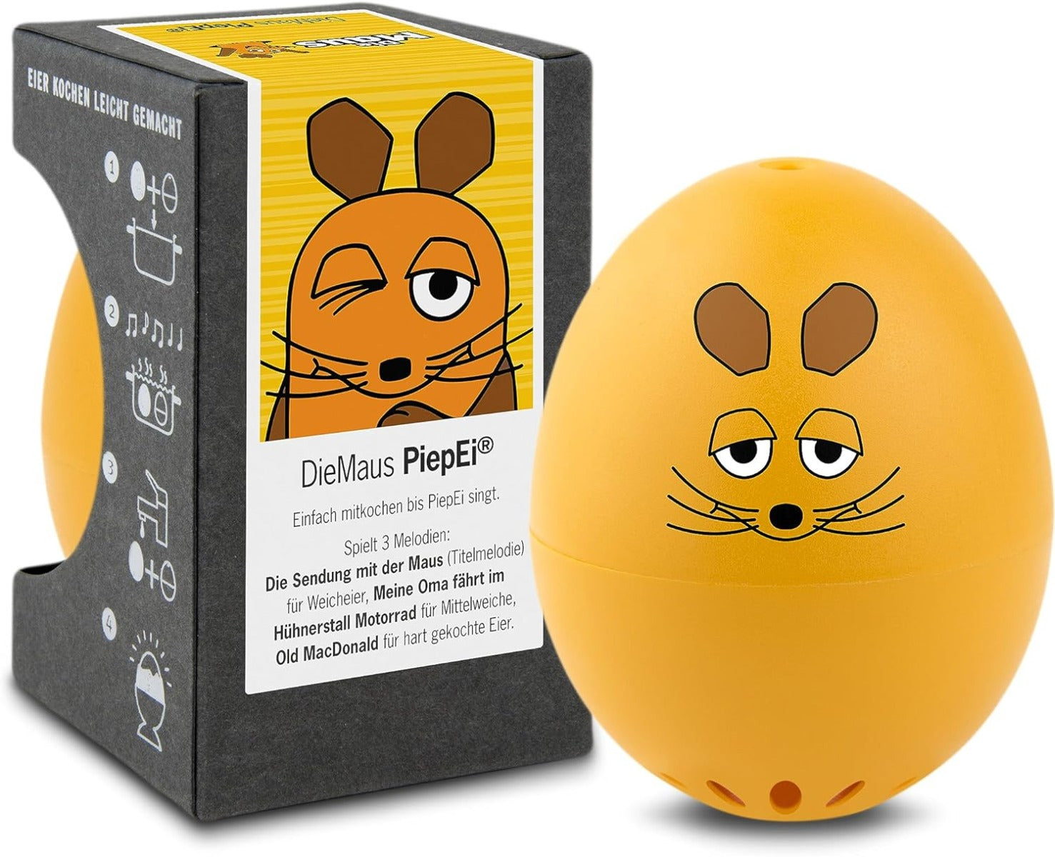 Zu weich, zu hart – aber nie auf den Punkt. Perfekt gekochte Eier sind eine Wissenschaft für sich. Für das PiepEi aber kein Problem. Einfach mit den Eiern lagern, zusammen mit den Eiern kochen und warten bis das PiepEi singt. Egal mit welcher Wassertemperatur man startet und egal auf welcher Höhe man kocht, das Ei wird perfekt.Ob weich, mittelweich oder hart gekocht, das Maus PiepEi spielt für jede Stufe eine andere Melodie. "DIE SENDUNG MIT DER MAUS" für weich gekochte Eier, "MEINE OMA FÄHRT..." für das perfekte mittelweiche Ei und "OLD MACDONALD", sobald das hart gekochte Ei fertig ist.