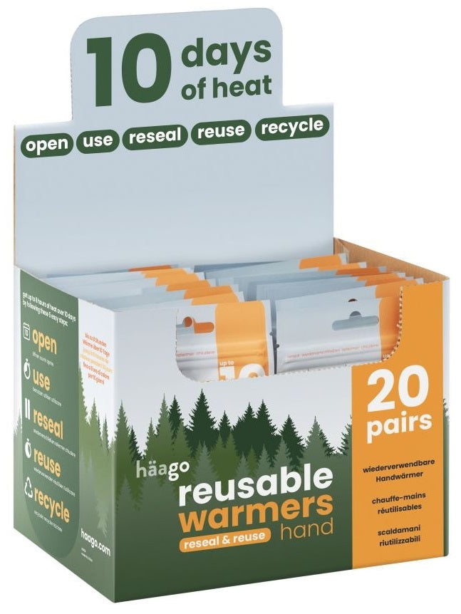 Die neuen wiederverwendbaren Handwärmer von Haago, erhältlich im 20er-Pack, bieten eine zuverlässige Lösung für kalte Tage im Freien. Jeder Handwärmer spendet bis zu 8 Stunden Wärme und kann innerhalb eines 10-tägigen Zeitraums mehrmals verwendet werden. Die Handhabung ist einfach: Durch Kontakt mit Sauerstoff aktivieren sich die Wärmer und können nach Nutzung wieder luftdicht verpackt werden, um die restliche Wärme später weiter zu nutzen. Die warmen Begleiter sind umweltfreundlich, da sie aus natürlichen Inhaltsstoffen bestehen und nach dem Gebrauch recycelt werden können. Ideal für Outdoor-Aktivitäten wie Skifahren, Golf oder Filmproduktionen bei kaltem Wetter.