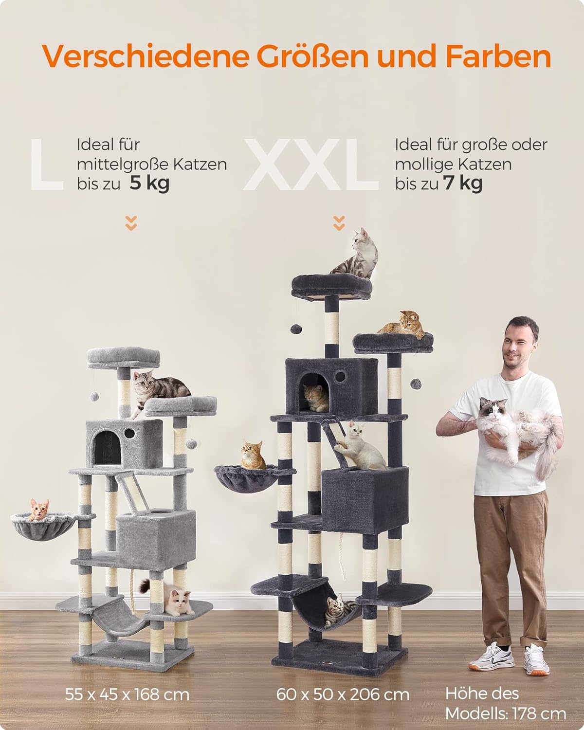 Entdecken Sie den Feandrea Kratzbaum, der nicht nur ein wahrer Spielplatz für Ihre Katzen ist, sondern auch ein stilvolles Möbelstück für Ihr Zuhause. Mit einer beeindruckenden Höhe von 168 cm bietet dieser grosse Katzenbaum ausreichend Platz für Ihre Samtpfoten, um zu klettern, zu spielen und sich auszuruhen. Der Feandrea Kratzbaum ist mit 13 stabilen Kratzsäulen ausgestattet, die Ihren Katzen helfen, ihre Kratzbedürfnisse zu befriedigen und gleichzeitig Ihre Möbel zu schützen. Die zwei grosszügigen Plattformen laden zum Entspannen und Beobachten ein, während die zwei gemütlichen Höhlen einen perfekten Rückzugsort bieten. Der integrierte Korb und die Hängematte sind ideale Plätze für ein Nickerchen und garantieren stundenlangen Komfort. Die Plüschbälle sorgen für zusätzlichen Spielspass und fördern die Aktivität Ihrer Katzen. In einem eleganten hellgrau gehalten, fügt sich der mehrstöckige Katzenkratzbaum harmonisch in jede Wohnumgebung ein und wird schnell zum Lieblingsplatz Ihrer Katzen. Gönnen Sie Ihren pelzigen Freunden den Feandrea Kratzbaum – ein Ort, an dem sie spielen, entspannen und sich wohlfühlen können!