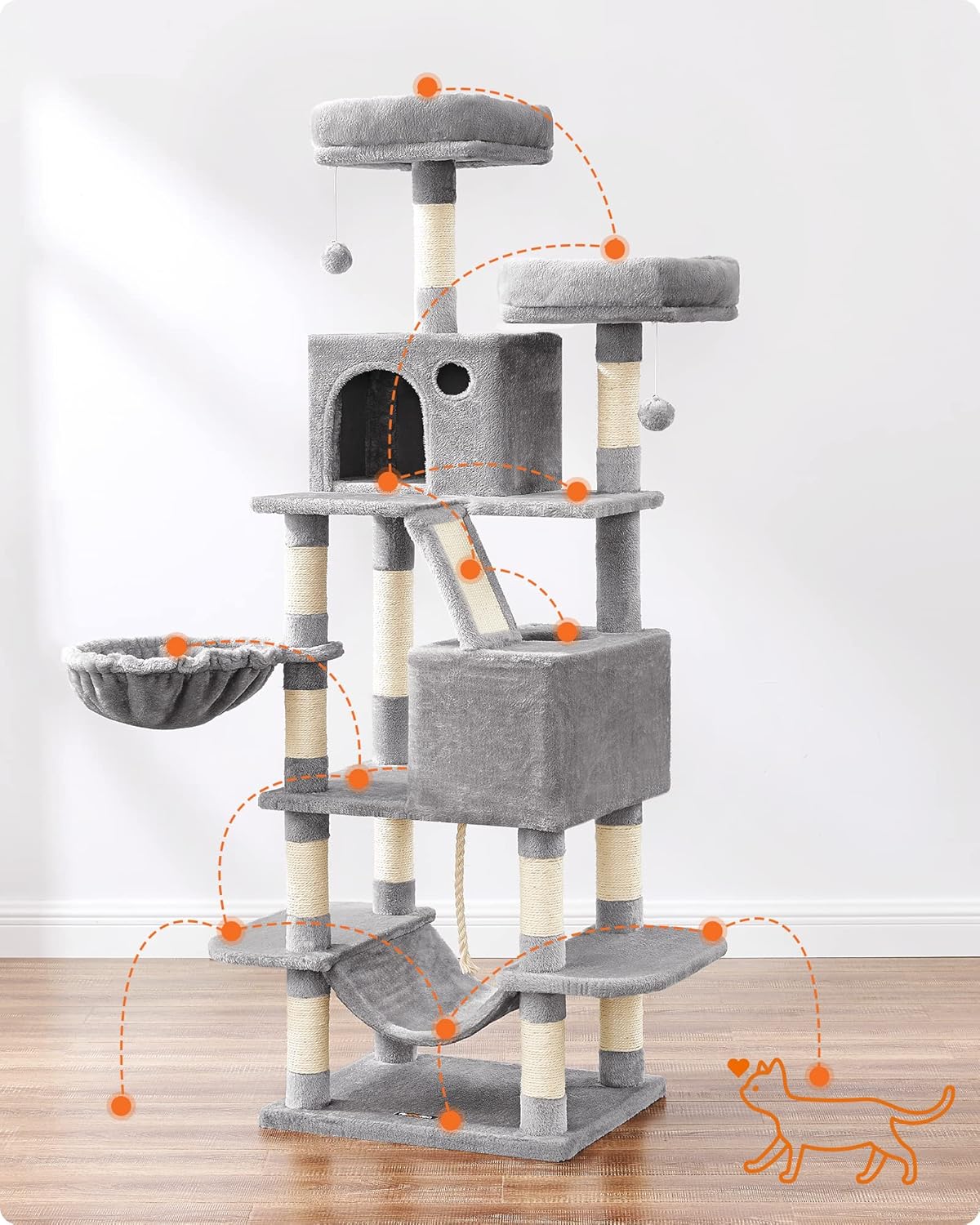Kunden sind begeistert vom robusten, 168 cm hohen Feandrea Kratzbaum: viel Platz zum Klettern, Spielen und Ausruhen. Besonders geschätzt werden die 13 stabilen Kratzsäulen, zwei Plattformen, zwei gemütliche Höhlen, Korb und Hängematte sowie die Plüschbälle. Das elegante Hellgrau passt perfekt ins Wohnambiente.