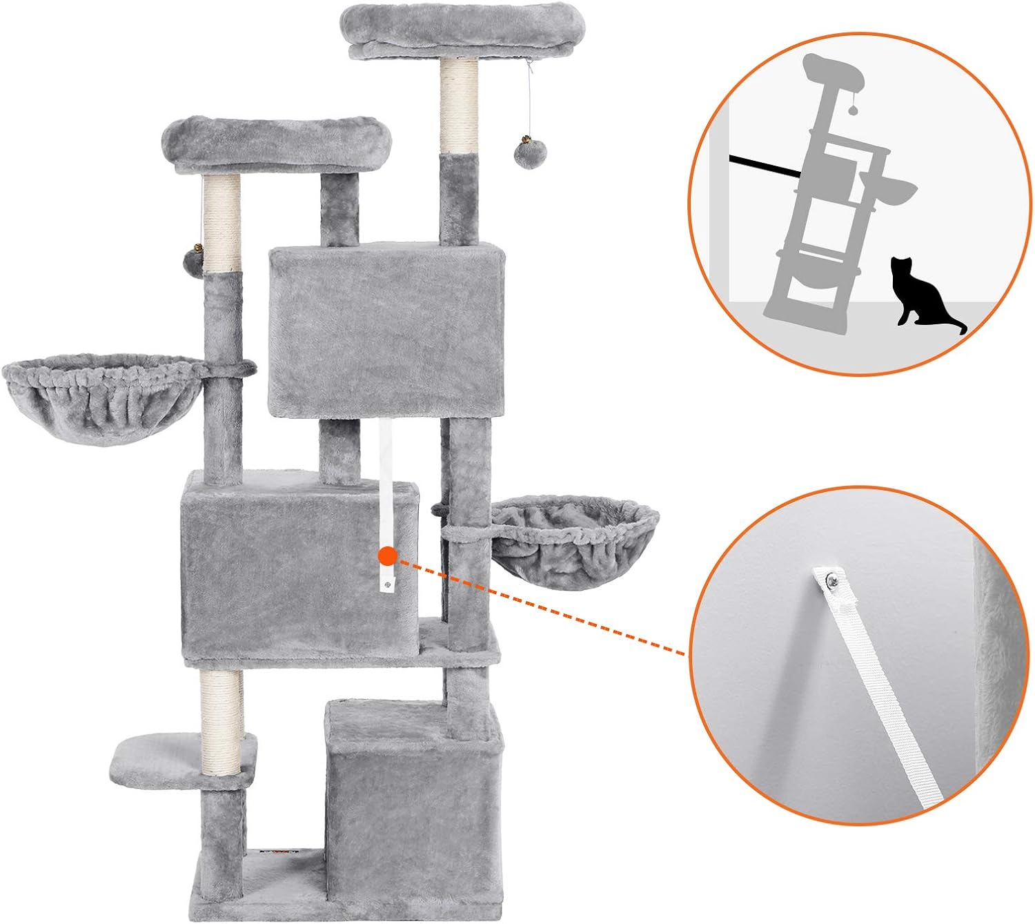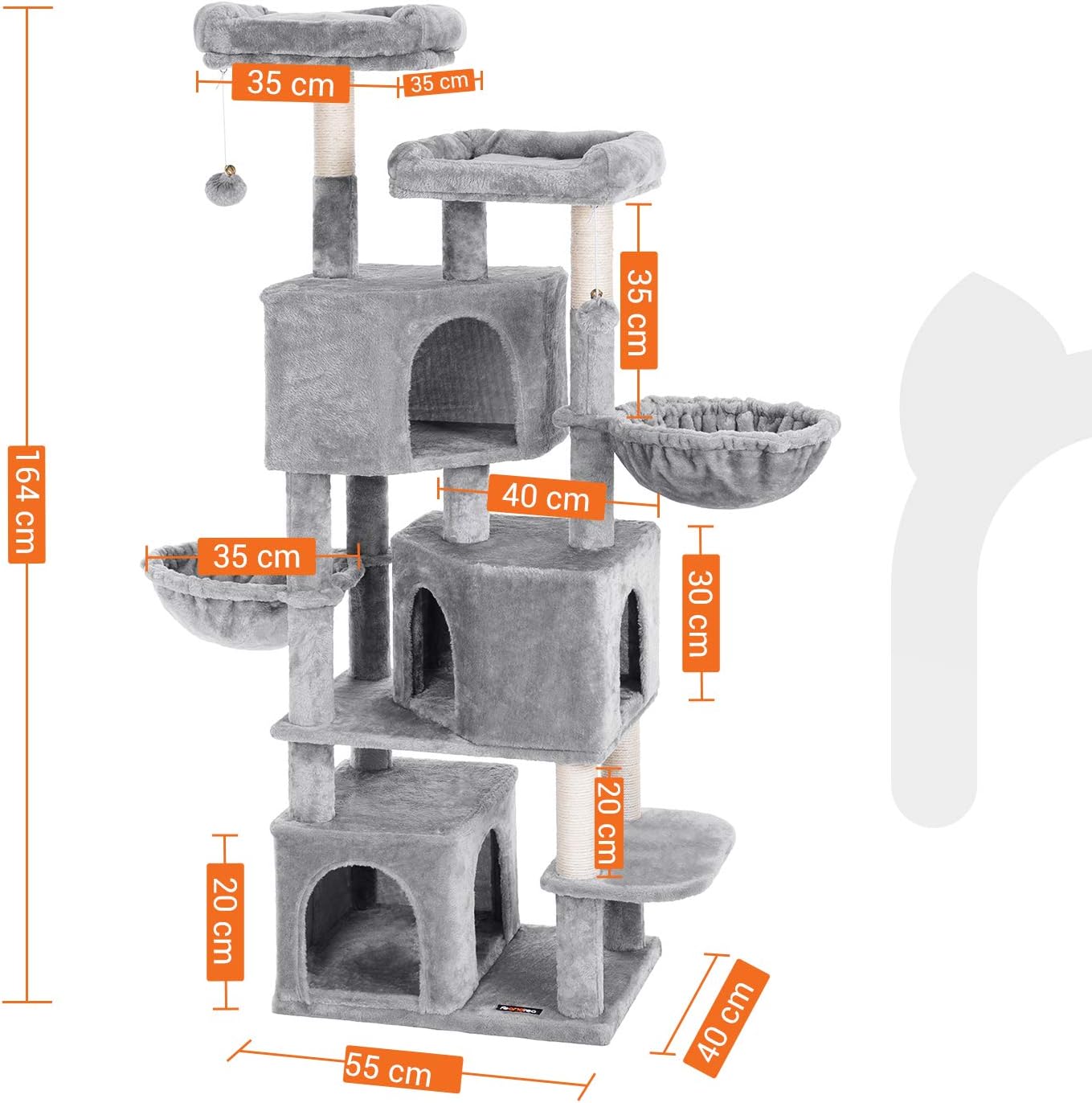 Entdecken Sie den Feandrea Kratzbaum in elegantem Hellgrau – das perfekte Spielparadies für Ihre geliebte Katze! Mit einer beeindruckenden Höhe von 164 cm und ausgestattet mit drei gemütlichen Katzenhöhlen, zwei Liegemulden und zwei gepolsterten Aussichtsplattformen, bietet dieser Kratzbaum ausreichend Platz für eine ganze Katzenfamilie. Sicherheit steht an erster Stelle: Die stabilen Sisalstämme und die verstärkte Bodenplatte sorgen dafür, dass Ihr kleiner Tiger sicher und geborgen spielen kann. Der integrierte Kippschutz erhöht zusätzlich die Standfestigkeit und macht diesen Kratzbaum zu einem zuverlässigen Rückzugsort. Ob verspielte Kätzchen oder gemütliche Senioren – die durchdachte Anordnung der Elemente ermöglicht es Katzen jeden Alters, mühelos zu klettern und zu erkunden. Die hochwertigen Materialien, darunter dicker Plüsch, kratzfestes Sisal und robuste MDF / Spanplatte-Platten, garantieren nicht nur Langlebigkeit, sondern auch den ultimativen Komfort für selbst die wählerischsten Stubentiger. Und falls Sie noch Fragen haben, steht Ihnen unser katzenfreundlicher Kundenservice jederzeit zur Verfügung. Beschenken Sie Ihre Samtpfote mit diesem stilvollen und funktionalen Kratzbaum – ein echtes Highlight für jedes Zuhause!