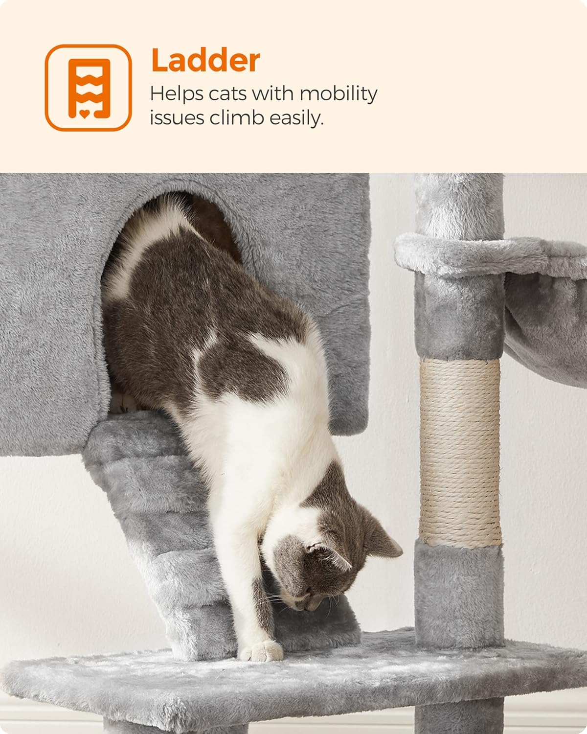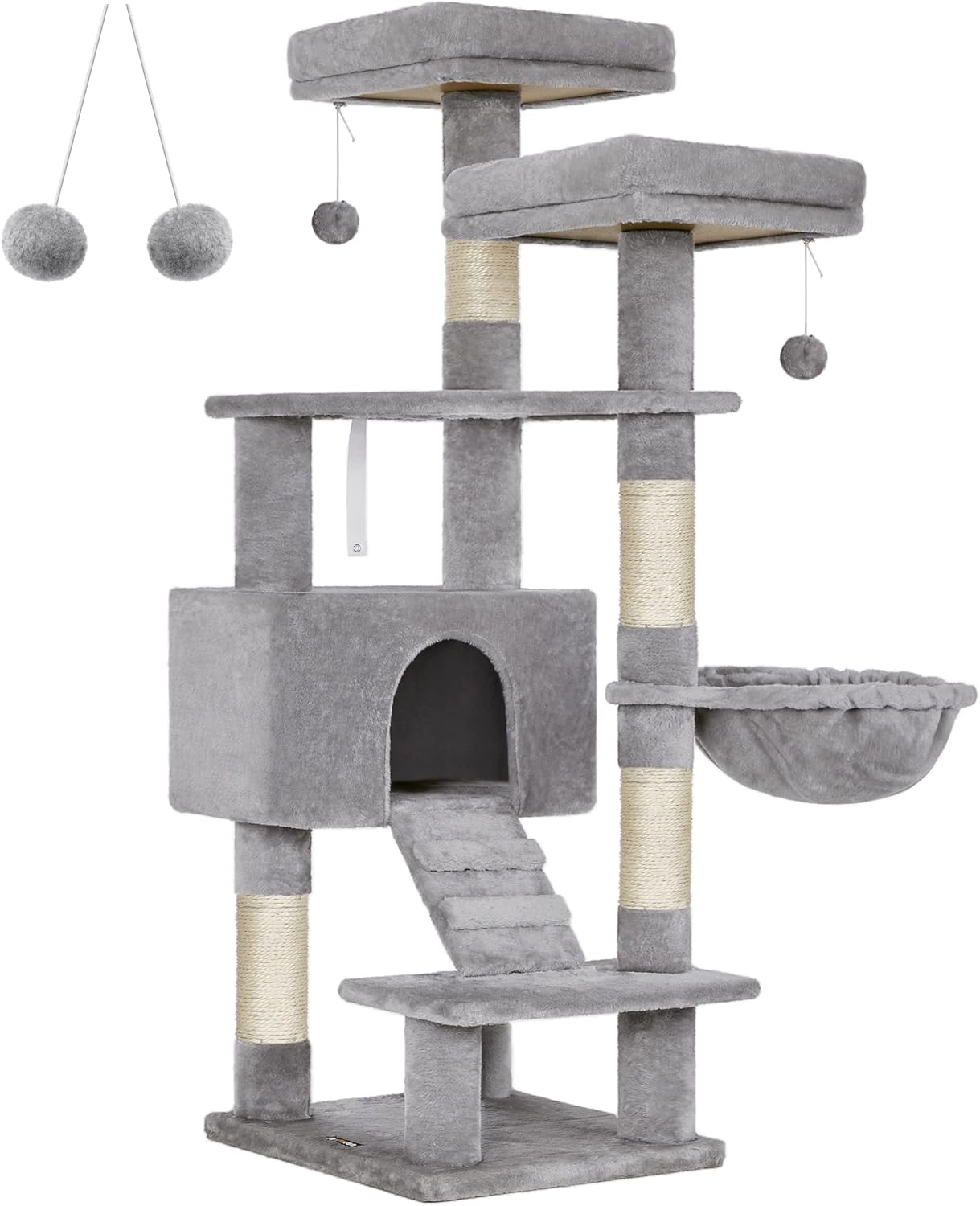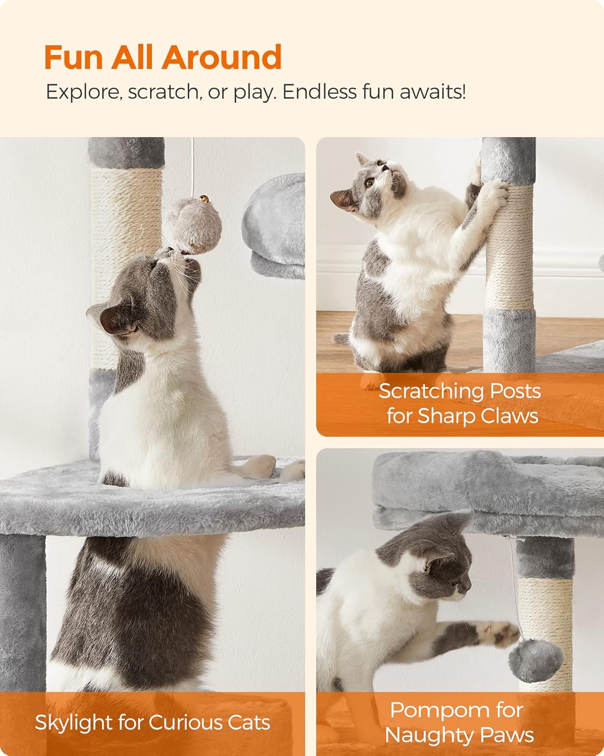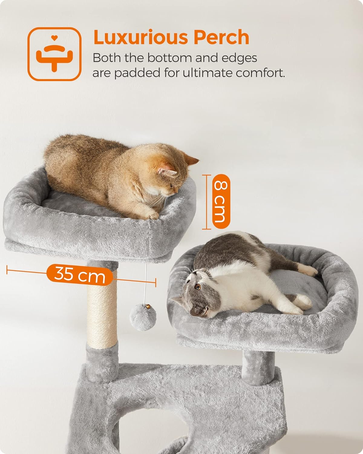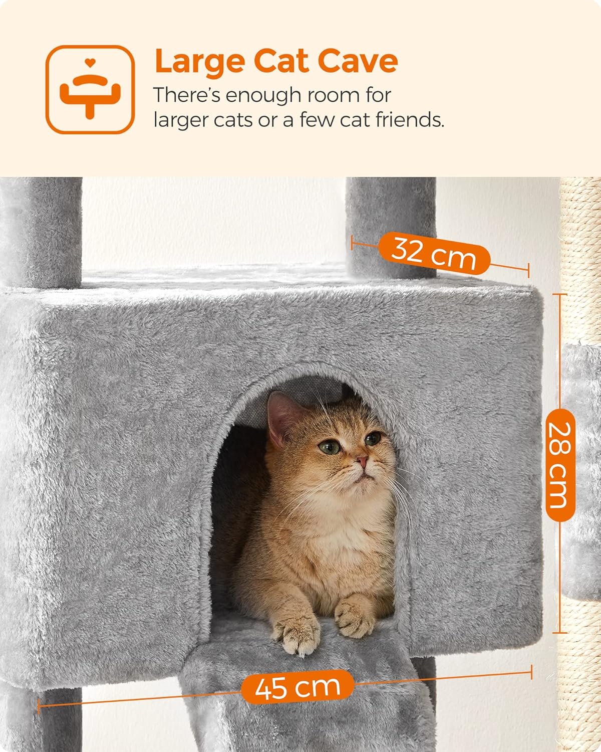 Kunden sind besonders begeistert von der Kombination aus Spielspaß und Komfort: zwei Aussichtsplattformen, geräumige Kuschelhöhle mit Rampe, bequeme Liegemulde und flauschiger Fellball. Sicherheitsmerkmale wie verstärktes Fundament und Kippschutz geben Vertrauen. Die Sisalstämme schützen Möbel und befriedigen Kratzbedürfnis. Stilvolles hellgraues Design passt ins Zuhause.