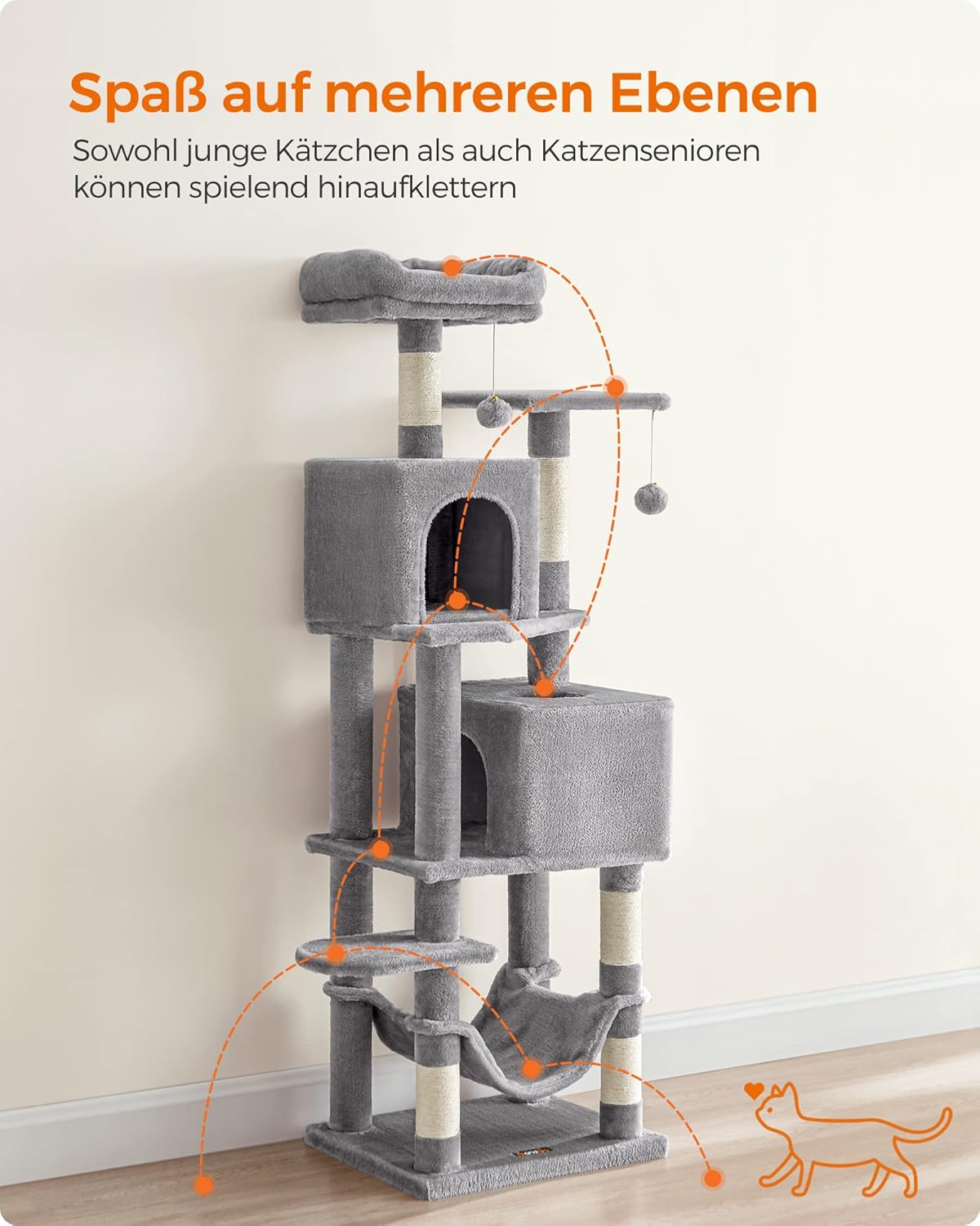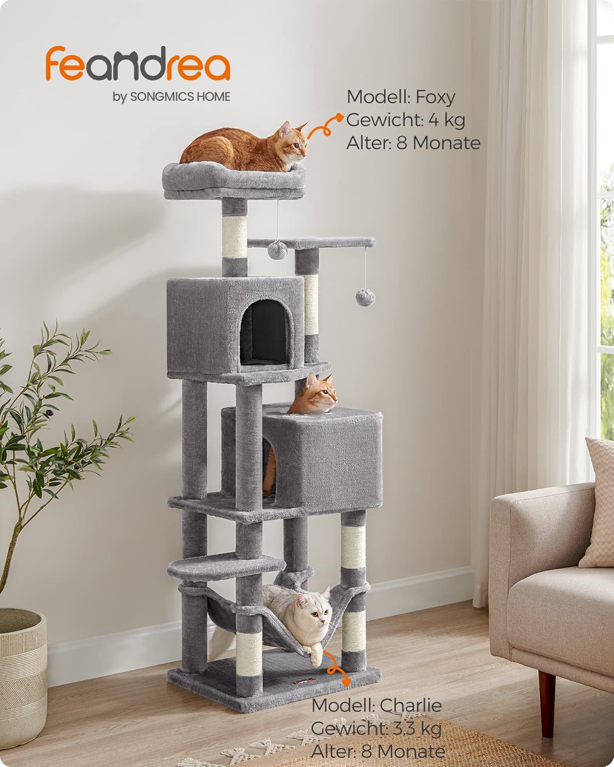 Entdecken Sie den Feandrea Kratzbaum – das ultimative Kletterparadies für Ihre Katzen! Mit einer beeindruckenden Höhe von 155 cm bietet dieser Katzenbaum nicht nur ausreichend Platz zum Spielen und Entspannen, sondern auch ein stilvolles Design in elegantem hellgrau, das sich harmonisch in Ihr Zuhause einfügt. Der Feandrea Kratzbaum ist mit 5 stabilen Kratzsäulen ausgestattet, die Ihren Katzen helfen, ihre Krallen zu pflegen und gleichzeitig die Möbel zu schonen. Die zwei grosszügigen Plattformen und die zwei gemütlichen Katzenhöhlen bieten Ihren Vierbeinern zahlreiche Rückzugsmöglichkeiten und Aussichtspunkte, ideal für Familien mit mehreren Katzen. Dank des mehrstufigen Designs können Ihre pelzigen Freunde spielend leicht auf- und absteigen. Jede Ebene ist ein neuer Entdeckungsort, der den natürlichen Spieltrieb Ihrer Katzen anregt. Die zwei hängenden Plüschbälle sorgen für zusätzlichen Spass und fördern den Jagdinstinkt Ihrer Katzen – und mit den zwei Ersatz-Plüschbällen sind Sie bestens ausgestattet. Die Montage des Kratzbaums ist kinderleicht! Mit den mitgelieferten Universalschrauben und dem Schraubenschlüssel kann eine Person den Katzenbaum schnell und unkompliziert aufbauen. Sicherheit wird bei Feandrea grossgeschrieben: Die robuste Struktur und die verstärkte Bodenplatte garantieren Stabilität, selbst wenn bis zu fünf Katzen (jeweils bis zu 5 kg) darauf toben. Und keine Sorge um die Reinigung – Haare und Schmutz lassen sich mühelos mit einer Fusselrolle oder einem Staubsauger entfernen. Gönnen Sie Ihren Katzen den Feandrea Kratzbaum und verwandeln Sie Ihr Zuhause in ein wahres Katzenparadies!