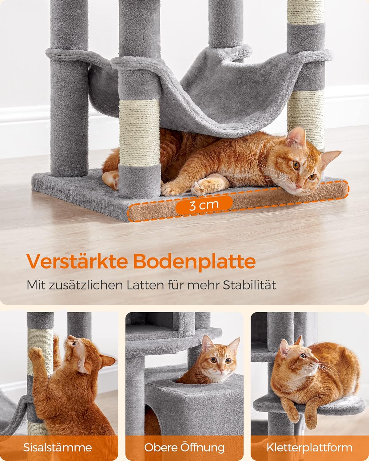 Kunden sind begeistert von der großzügigen Höhe und dem stilvollen Design des Feandrea Kratzbaums. Besonders geschätzt werden die stabilen Kratzsäulen, die vielen Plattformen und Höhlen, die zwei hängenden (plus Ersatz-) Plüschbälle, die robuste Bodenplatte sowie die einfache Montage und leichte Reinigung.