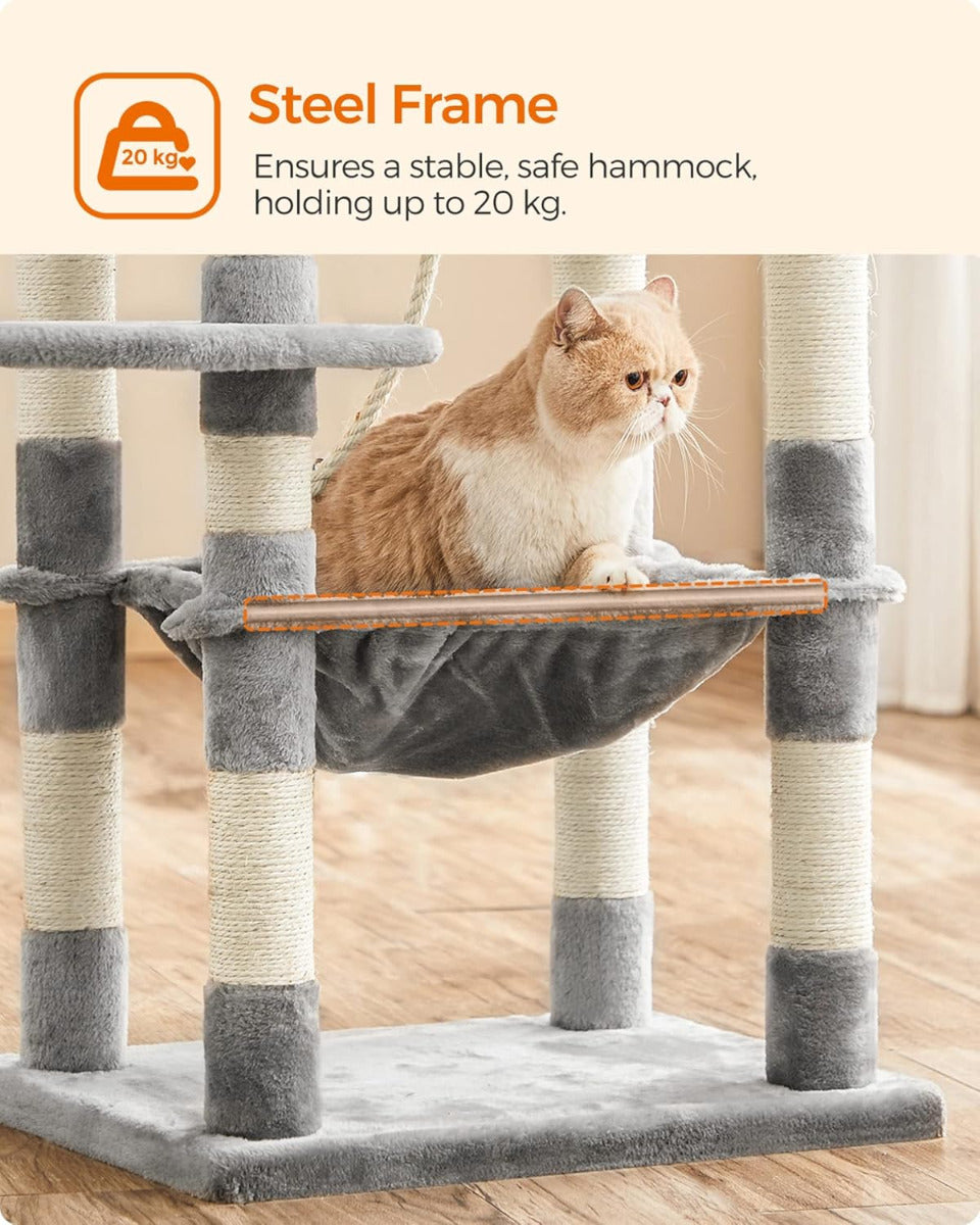 Kunden sind begeistert von der stabilen Höhe und dem mehrstufigen Design, das ideal für mehrere Katzen ist. Geliebt werden die gepolsterten Plattformen, Kuschelhöhle und bequeme Hängematte, die Sisal-Kratzsäulen sowie die hängenden Plüschbälle. Positiv hervorgehoben werden auch die einfache Montage und die unkomplizierte Reinigung.