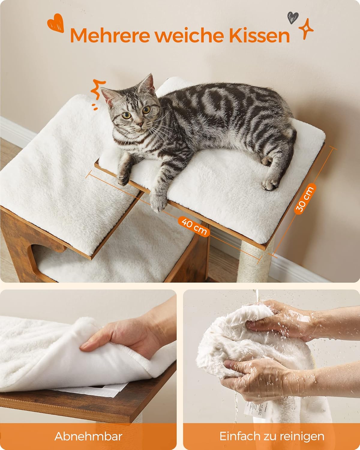 Stabile, kippsichere Konstruktion für mehrere Katzen, Sisal-Kratzsäule und Kratzmatte schützen Möbel, Weiche abnehmbare Plüschkissen, leicht von Hand waschbar