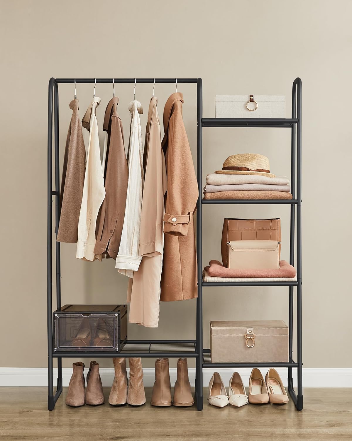 Der SONGMICS Garderobenständer HSR138B01 in Matt-Schwarz kombiniert eine 25-kg-Kleiderstange mit fünf unterschiedlich belastbaren Gitterablagen und bietet auf kompakter Fläche übersichtlichen Stauraum für Kleidung, Schuhe und Accessoires. Mit 70-kg-Gesamttragkraft, leichtem Stahlrahmen, Anti-Kipp-Set und schneller Montage ist er eine stabile, vielseitige und stilvolle Lösung für Flur, Schlafzimmer oder Ankleidezimmer.