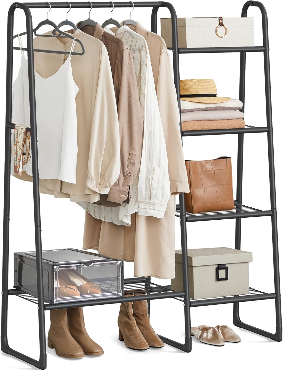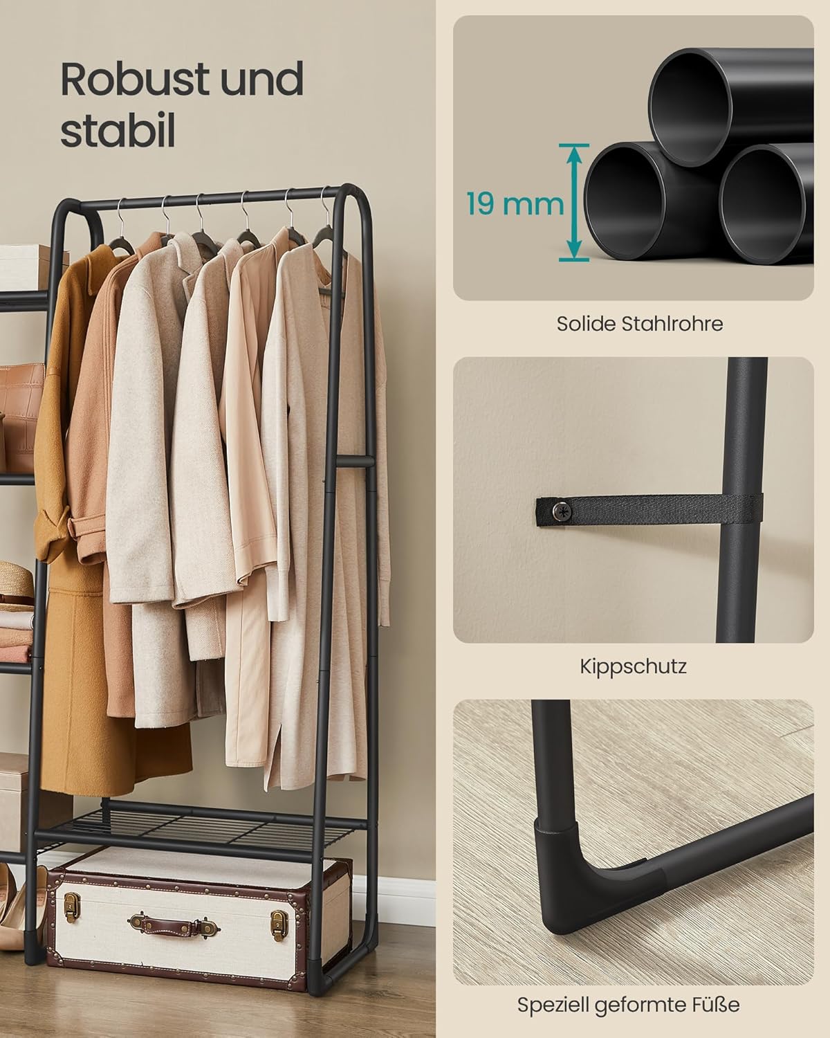 Platzsparende Kombination aus Kleiderstange und fünf Ablagen für Kleidung, Taschen und Schuhe, Belastbare Konstruktion bis 70 kg Gesamttragfähigkeit mit Kleiderstange bis 25 kg, Schnelle Montage mit Anti-Kipp-Set für sichere Nutzung