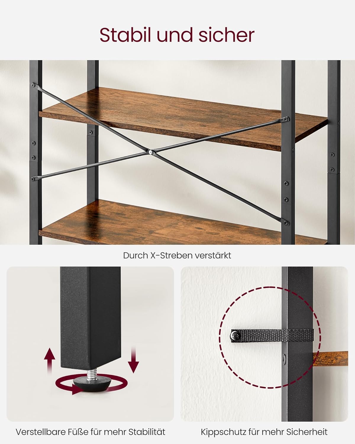 Entdecken Sie das SONGMICS Bücherregal mit 6 Ebenen – die perfekte Lösung für all Ihre Aufbewahrungsbedürfnisse! Mit seinen grosszügigen Abmessungen von 30 x 80 x 186 cm bietet dieses freistehende Regal nicht nur viel Stauraum, sondern auch die Möglichkeit, Ihre Lieblingsbücher, stilvolle Dekorationen und grüne Pflanzen in Szene zu setzen. Egal, ob im Wohnzimmer, Schlafzimmer oder Arbeitszimmer, dieses Regal fügt sich harmonisch in jeden Raum ein. Hergestellt aus hochwertigen Spanplatten und einem robusten Stahlrahmen, ist dieses Bücherregal nicht nur langlebig, sondern auch äusserst stabil. Es trägt bis zu 50 kg und sorgt dafür, dass Ihre Schätze sicher und fest an ihrem Platz bleiben. Der Aufbau könnte nicht einfacher sein! Dank der gekennzeichneten Teile und der leicht verständlichen Anleitung haben Sie Ihr neues Regal im Handumdrehen montiert. Für zusätzliche Stabilität sorgt das durchdachte Design mit X-förmigen Stangen und verstellbaren Füssen, die das Regal auch auf leicht unebenen Böden ins Gleichgewicht bringen. Der integrierte Kippschutz ermöglicht eine sichere Wandmontage und gibt Ihnen die Gewissheit, dass alles an seinem Platz bleibt. Der industrielle Look, geprägt von der Kombination aus vintagebraunen Spanplatten und einem tintenschwarzen Stahlrahmen, verleiht Ihrem Zuhause eine moderne Note. Dieses Regal ist nicht nur funktional, sondern auch ein echter Hingucker, der Ihren Einrichtungsstil aufwertet. Holen Sie sich das SONGMICS Bücherregal und bringen Sie Ordnung und Stil in Ihr Zuhause!