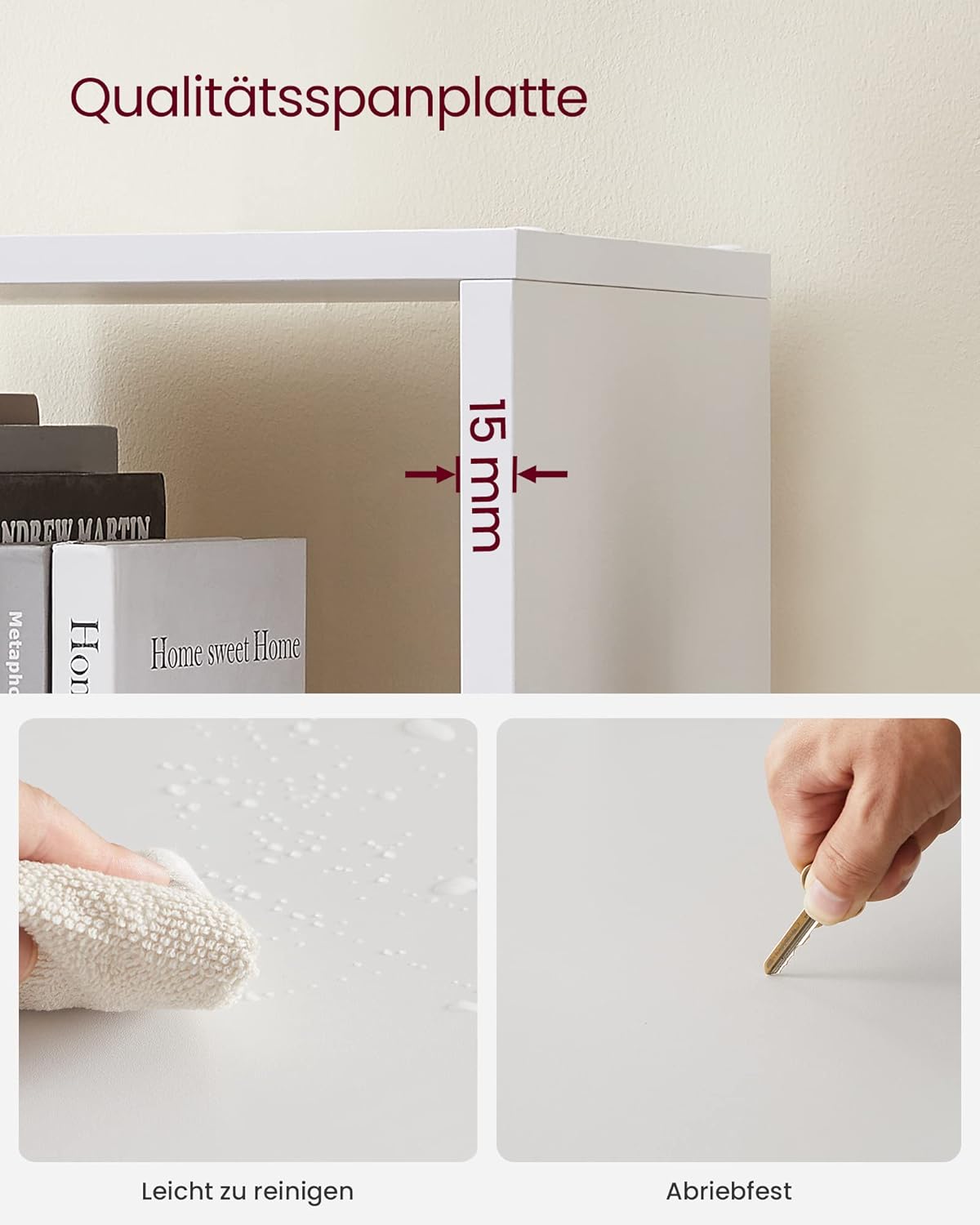 Kunden begeistern vor allem das zeitlose Wolkenweiß und das durchdachte, kompakte Design. Geliebt werden die robusten 15 mm Spanplatten, die hohe Stabilität (27,3 kg), die 10 offenen Fächer für Bücher und Deko, die flexiblen Innenmaße für Aufbewahrungsboxen, der mitgelieferte Kippschutz sowie die einfache Montage — vielseitig einsetzbar als Regal, Raumteiler oder Dekoelement.