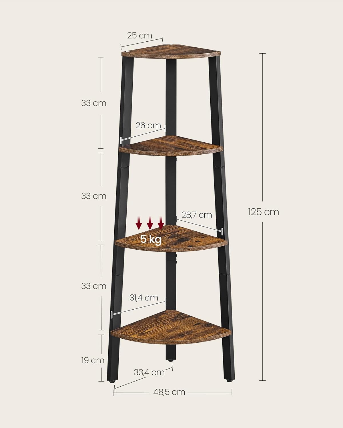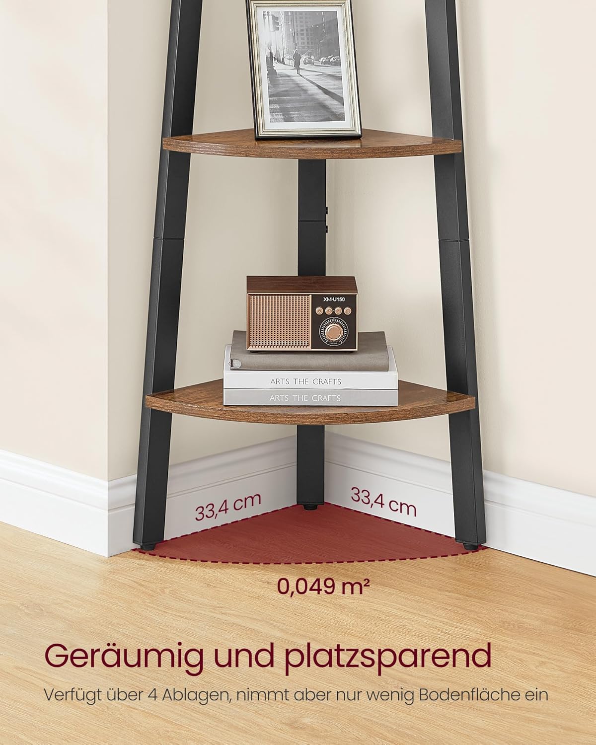 Entdecken Sie das SONGMICS Eckregal – die perfekte Lösung, um leere Ecken in Ihrem Zuhause stilvoll zu nutzen! Mit seinem modernen Industrial-Design und der Kombination aus vintagebraunem Holz und schwarzem Stahlrahmen wird dieses Bücherregal nicht nur zum praktischen Aufbewahrungsort, sondern auch zum echten Hingucker in jedem Raum. Ob im Wohnzimmer, Arbeitszimmer, Eingangsbereich, Esszimmer oder Schlafzimmer – dieses vielseitige Regal passt sich mühelos Ihren Bedürfnissen an. Mit einer Grösse von 33,4 x 33,4 x 125 cm bietet das 4-stufige Leiterregal ausreichend Platz für Ihre Lieblingsbücher, Pflanzen, Bilderrahmen und andere Dekorationen. Maximieren Sie Ihren Eckraum und bringen Sie Ordnung in Ihr Zuhause! Die Montage des SONGMICS Eckregals ist kinderleicht. Dank der klaren Anleitung, beschrifteter Teile und vorgebohrter Schraublöcher in den Metallstangen ist der Aufbau im Handumdrehen erledigt. So können Sie schnell und unkompliziert Ihr neues Regal geniessen. Für maximale Stabilität sorgt die durchdachte 3-Bein-Struktur, von denen eines mit einem verstellbaren Fuss ausgestattet ist. Das Regal steht sicher auf dem Boden und kann problemlos an die Wand angepasst werden. Der integrierte Kippschutz garantiert zudem eine sichere Nutzung, sodass Sie sich ganz auf die Gestaltung Ihres Wohnraums konzentrieren können. Verleihen Sie Ihrem Zuhause mit dem SONGMICS Eckregal einen Hauch von Industrial-Flair und schaffen Sie gleichzeitig einen funktionalen Stauraum. Holen Sie sich dieses stilvolle Aufbewahrungsregal und setzen Sie Ihre Einrichtung gekonnt in Szene!