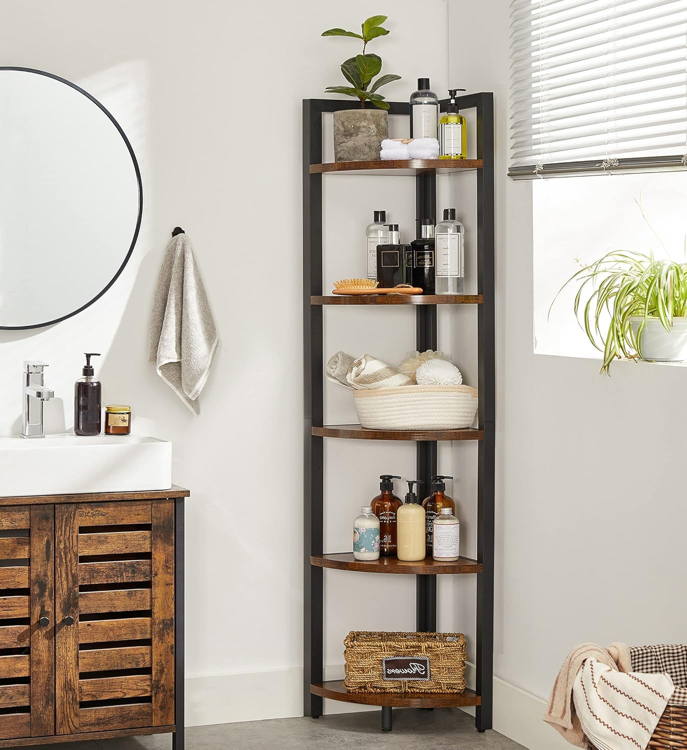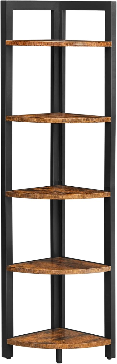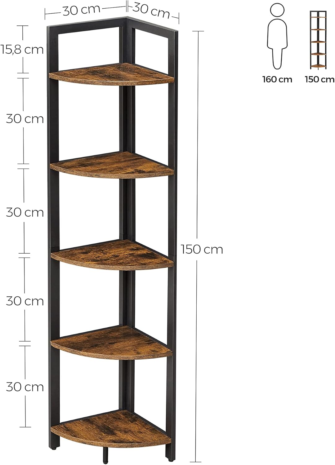 Entdecken Sie das SONGMICS Eckregal mit 5 Ablagen – die perfekte Lösung für stilvolle Aufbewahrung und Präsentation in jedem Raum! Mit seinen kompakten Massen von 30 x 30 x 150 cm passt dieses multifunktionale Regal mühelos in jede Ecke Ihres Wohnzimmers, Schlafzimmers, Büros oder sogar in die Küche. Das ansprechende Industrie-Design in vintagbraun und schwarz verleiht Ihrem Raum einen modernen, urbanen Touch. Dank des robusten Stahlrahmens und der strapazierfähigen Spanplatten bietet das Regal nicht nur eine ansprechende Optik, sondern auch eine beeindruckende Stabilität. Jedes Regal kann mit bis zu 5 kg belastet werden, sodass Sie Ihre Bücher, Sukkulenten, Bilderrahmen und Figuren sicher präsentieren können. Die 5 separaten Ablagen mit einem Abstand von 30 cm zwischen den Ebenen bieten ausreichend Platz für all Ihre Lieblingsstücke. Um zusätzliche Sicherheit zu gewährleisten, sind im Lieferumfang 2 Anti-Kipp-Kits enthalten, die eine Wandbefestigung ermöglichen. So können Sie Ihr Regal ganz entspannt nutzen, ohne sich um die Stabilität sorgen zu müssen. Die Montage gestaltet sich dank der nummerierten Teile, der leicht verständlichen Anleitung und der mitgelieferten Werkzeuge kinderleicht. In kürzester Zeit steht Ihr neues Regal bereit, um Ihre Gegenstände stilvoll in Szene zu setzen. Bringen Sie frischen Wind in Ihre Einrichtung mit dem SONGMICS Eckregal – ein vielseitiges Möbelstück, das Funktionalität und Design perfekt vereint!