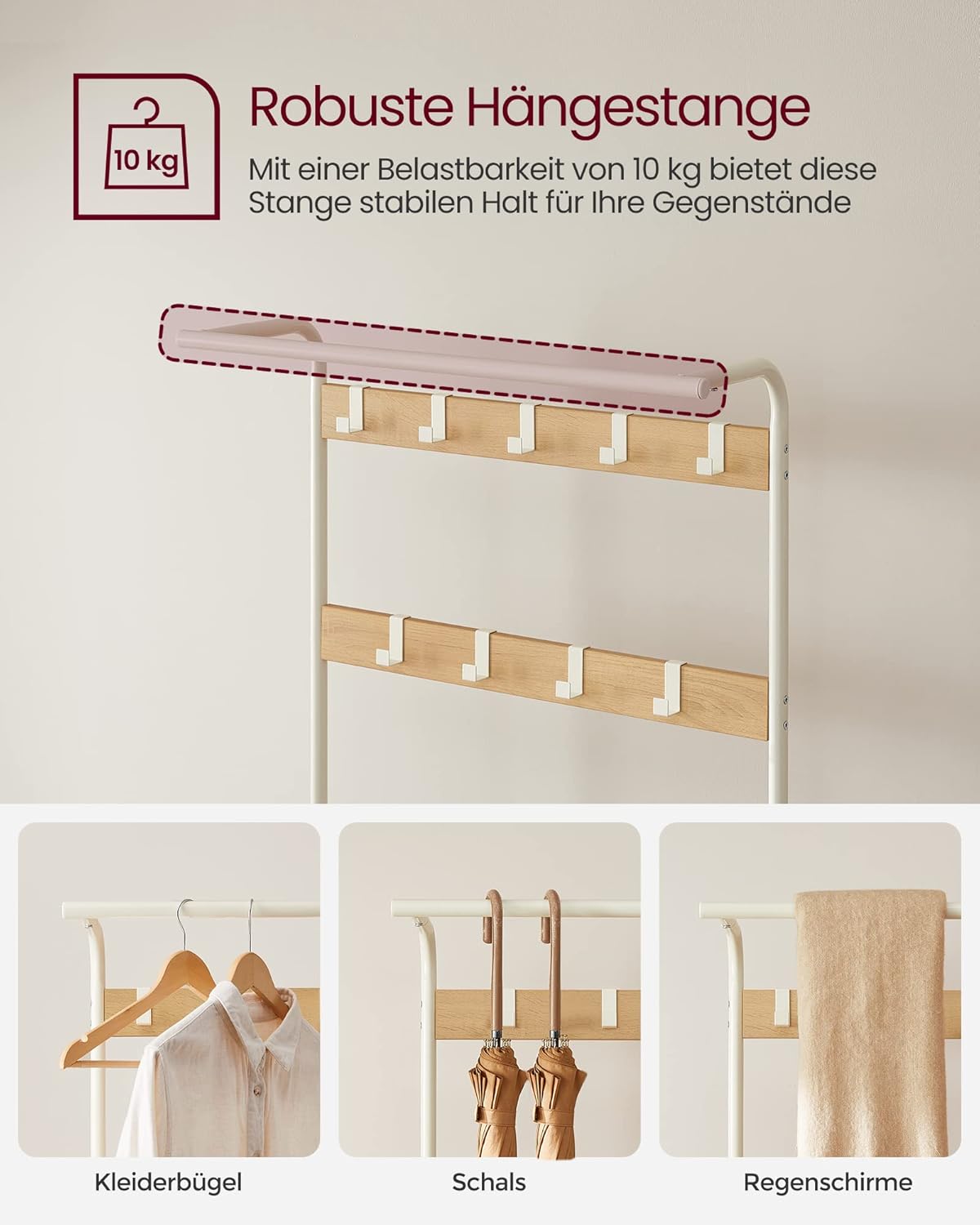 Verleihen Sie Ihrem Eingangsbereich mit der stilvollen SONGMICS Garderobe aus der Kollektion DAINTREE einen eleganten Akzent und geniessen Sie gleichzeitig die praktische Funktionalität von 9 abnehmbaren Haken und einer stabilen Kleiderstange. Die einfache Montage macht es Ihnen leicht, Ordnung und Stil in Ihr Zuhause zu bringen.