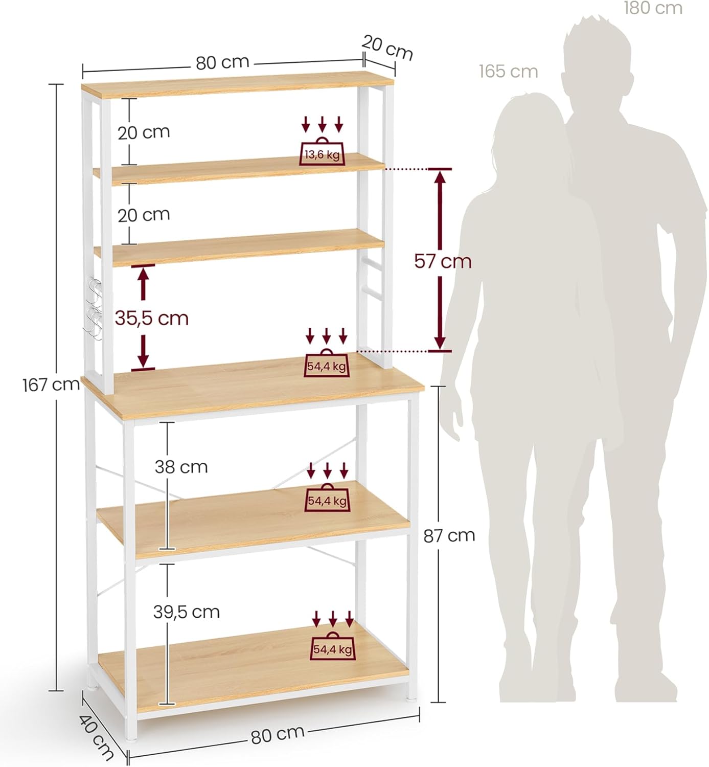 Entfesseln Sie Ihre Kreativität mit dem SONGMICS Küchenregal – der perfekten Lösung für Ihre Küche! Dieses vielseitige Standregal bietet nicht nur Platz für Ihre Mikrowelle und Kaffeemaschine, sondern verwandelt sich auch in eine gemütliche Kaffee- oder Essecke. Mit seinen 6 Ablagen und 6 Haken haben Sie ausreichend Stauraum für all Ihre Küchenutensilien und -schätze. Die mittlere Ablage im unteren Bereich ist höhenverstellbar und passt sich Ihren Bedürfnissen an. Egal, ob Sie einen Mixer, eine Heissluftfritteuse oder grosse Töpfe unterbringen möchten, dieses Regal bietet die Flexibilität, die Sie benötigen. Dank der soliden Konstruktion aus robustem Stahlrahmen und langlebigen Spanplatten ist das eichenfarbene Standregal nicht nur stark, sondern auch äusserst stabil. Mit den kompakten Massen von 40 x 80 x 167 cm ist es ideal für kleine Küchen und nutzt den verfügbaren Platz optimal aus. Sicherheit steht an erster Stelle: Die verstellbaren Füsse sorgen dafür, dass das Regal stabil auf Ihrem Boden steht und keine Kratzer hinterlässt. Der beiliegende Kippschutz ermöglicht eine sichere Befestigung an der Wand, sodass Sie sich keine Sorgen um die Sicherheit Ihrer Familie machen müssen. Und der Aufbau? Kein Problem! Mit der klaren Anleitung, den gekennzeichneten Teilen und dem mitgelieferten Montagewerkzeug ist Ihr neues Küchenregal im Handumdrehen einsatzbereit. Entdecken Sie die Vielseitigkeit und den Stil des SONGMICS Küchenregals und bringen Sie Ordnung und Eleganz in Ihre Küche!