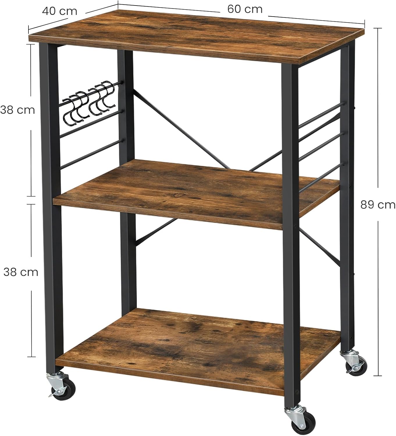 Entdecken Sie das SONGMICS Küchenregal auf Rollen – die perfekte Lösung für Ihre Küche! Mit seinen kompakten Massen von 40 x 60 x 89 cm und drei grosszügigen Ebenen bietet dieser Servierwagen nicht nur ausreichend Platz für Ihren Mini-Backofen oder Ihre Mikrowelle, sondern auch für all Ihre Küchenutensilien. Der Abstand zwischen den Ablagen von 38 cm sorgt dafür, dass auch grössere Geräte problemlos Platz finden. Seine Vielseitigkeit ist beeindruckend: Nutzen Sie das Regal als stilvolle Bühne für Ihre Küchenschätze oder verwandeln Sie es in eine gemütliche Kaffee- oder Essecke. Die vintagebraune und tintenschwarze Farbgebung fügt sich harmonisch in jede Kücheneinrichtung ein. Dank der vier Universalrollen, von denen zwei mit einer Bremse ausgestattet sind, lässt sich der Servierwagen mühelos bewegen und an jedem gewünschten Ort fixieren. So haben Sie immer die Flexibilität, die Sie in Ihrer Küche benötigen. Robust und langlebig – das Küchenregal besteht aus hochwertigen Spanplatten und einem stabilen Stahlrahmen, der durch X-förmige Streben auf der Rückseite verstärkt wird. So bleibt alles sicher an seinem Platz, egal wie viel Sie darauf abstellen. Zusätzlich erhalten Sie sechs abnehmbare S-förmige Haken, die Ihnen helfen, Schöpflöffel, Pfannenwender und Topflappen griffbereit aufzuhängen. Der Aufbau ist kinderleicht: Mit der beiliegenden klaren Anleitung und den gekennzeichneten Teilen ist Ihr neuer Servierwagen im Handumdrehen einsatzbereit. Setzen Sie Ihre Fantasie frei und entdecken Sie die Vielseitigkeit des SONGMICS Küchenregals auf Rollen – die ideale Ergänzung für jede Küche!