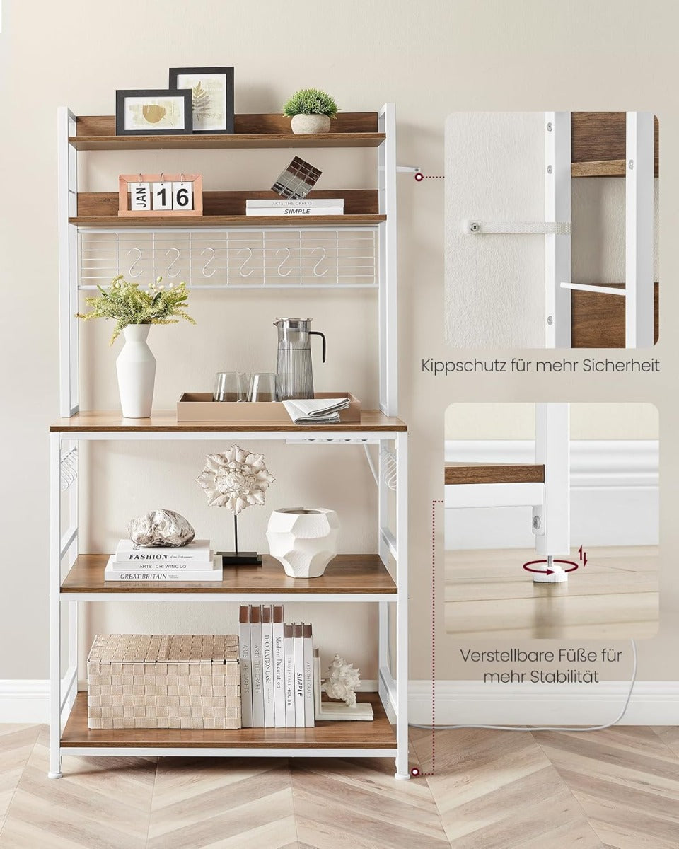 Das VASAGLE Küchenregal KKS025W41EU in edlem walnussbraun-weiss ist die perfekte Kombination aus Stil, Stabilität und praktischer Funktionalität für Ihre Küche oder Essnische: Mit Massen von 40 x 80 x 170 cm (T x B x H) und einem Gesamtgewicht von 21,1 kg besteht das Regal aus hochwertigen Spanplatten in warmem Light Walnut Brown und einem stabilen weissen Stahlrahmen, der ein Gesamttragvermögen von bis zu 274,5 kg ermöglicht. Die durchdachte Aufteilung bietet eine Vielzahl an Ablagemöglichkeiten: eine obere Ablage (max. statische Belastbarkeit 20,4 kg), eine Arbeitsfläche/Arbeitsplatte (max. 45,4 kg), eine verstellbare mittlere Ablage (max. 59 kg), die sich um 4,1 cm nach oben oder unten justieren lässt, sowie eine untere Ablage (max. 59 kg) – so finden vom Toaster über Mixer bis zur Mikrowelle alle Utensilien ihren Platz. Zusätzliche Funktionalität bieten eine Gitterplatte für optimale Luftzirkulation, 14 praktische Haken mit einer Belastbarkeit von jeweils bis zu 5 kg zum Aufhängen von Küchenhelfern sowie eine integrierte Steckdosenleiste mit 4 Anschlüssen und einer Maximalleistung von 1875 Watt; die Steckdosenleiste verfügt über Überlast- und Leckageschutz sowie einen Ein-/Ausschalter für erhöhte Sicherheit und ein aufgeräumtes Kabelmanagement dank Einbau-Design. Das Regal ist vielseitig einsetzbar – als Mikrowellenständer, Küchenregal, Kaffeeecke oder zusätzliche Ablagefläche – und hebt Ihre Einrichtung optisch an, ohne Kompromisse bei Stabilität und Funktion einzugehen. Lieferumfang: 1 x Küchenregal, 1 x Zubehörpaket, 1 x Aufbauanleitung; der Aufbau gelingt dank klarer Anleitung und gekennzeichneter Teile schnell und unkompliziert, sodass Sie im Handumdrehen Ordnung und Komfort in Ihrer Küche schaffen können.