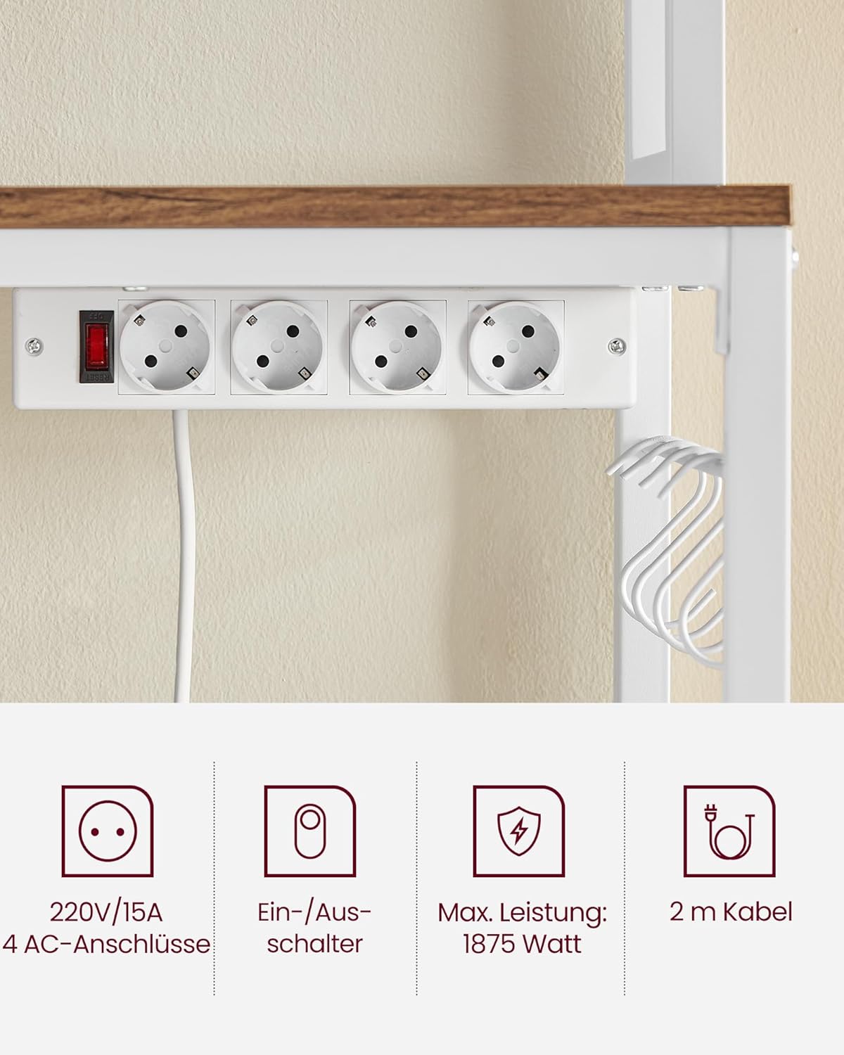 Stabile Ablageflächen für Mikrowelle, Mixer und Toaster mit bis zu 274,5 kg Gesamttragkraft, Verstellbare mittlere Ablage (4,1 cm) und 14 Haken für flexible Organisation, Integrierte 4‑fach Steckdosenleiste mit Überlast‑ und Leckageschutz und Ein/Aus‑Schalter
