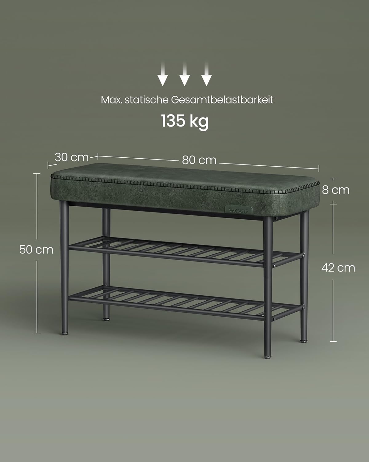 Die VASAGLE EKHO Schuhbank LSB054C01 in elegantem Waldgrün vereint preisgekröntes Design und durchdachte Funktionalität und ist damit die perfekte Ergänzung für Ihren Eingangsbereich: Ausgezeichnet mit dem Bronze A' Design Award 2024 zeigt diese Sitzbank, dass Stil zählt — hochwertige Kunstlederpolster mit feinen, präzisen Nähten verleihen ihr eine edle Optik im Mid-Century-Modern-Stil, während der glatte Bezug pflegeleicht bleibt und sich unkompliziert abwischen lässt. Komfort steht im Vordergrund: Die Sitzfläche ist mit 6 cm dickem, hochelastischem 25D Schaumstoff gepolstert, der sich angenehm anfühlt und seine Form langfristig behält, sodass Sie bei jedem Hinsetzen bequem Platz nehmen können. Trotz ihres schlanken Erscheinungsbildes ist die Bank robust konstruiert: Ein stabiler Stahlrahmen sorgt für festen Halt, verstellbare Universalfüsse gleichen unebene Böden aus und die maximale Tragfähigkeit von bis zu 135 kg macht die Bank belastbar und zuverlässig. Zusätzlich bietet die Schuhbank praktischen Stauraum unterhalb der Sitzfläche: Die Ablage liegt 10 cm über dem Boden, verfügt über drei Ebenen zur übersichtlichen Aufbewahrung Ihrer Schuhe und ist hoch genug für Saugroboter, sodass Ihre Räume sauber bleiben, ohne dass Sie störend umräumen müssen. Mit den kompakten Abmessungen 30 x 80 x 50 cm (Tiefe x Breite x Höhe), einem Artikelgewicht von nur 6,3 kg und der klaren, leicht verständlichen Montageanleitung inklusive Werkzeug ist der Aufbau schnell erledigt und die Bank sofort einsatzbereit. Ob als Sitzgelegenheit zum Anziehen der Schuhe, als dekoratives Möbelstück im Flur oder als praktische Sitztruhe mit zusätzlichem Stauraum — die VASAGLE EKHO Schuhbank kombiniert ästhetisches Design, Komfort und Alltagstauglichkeit in einem durchdachten Möbelstück.