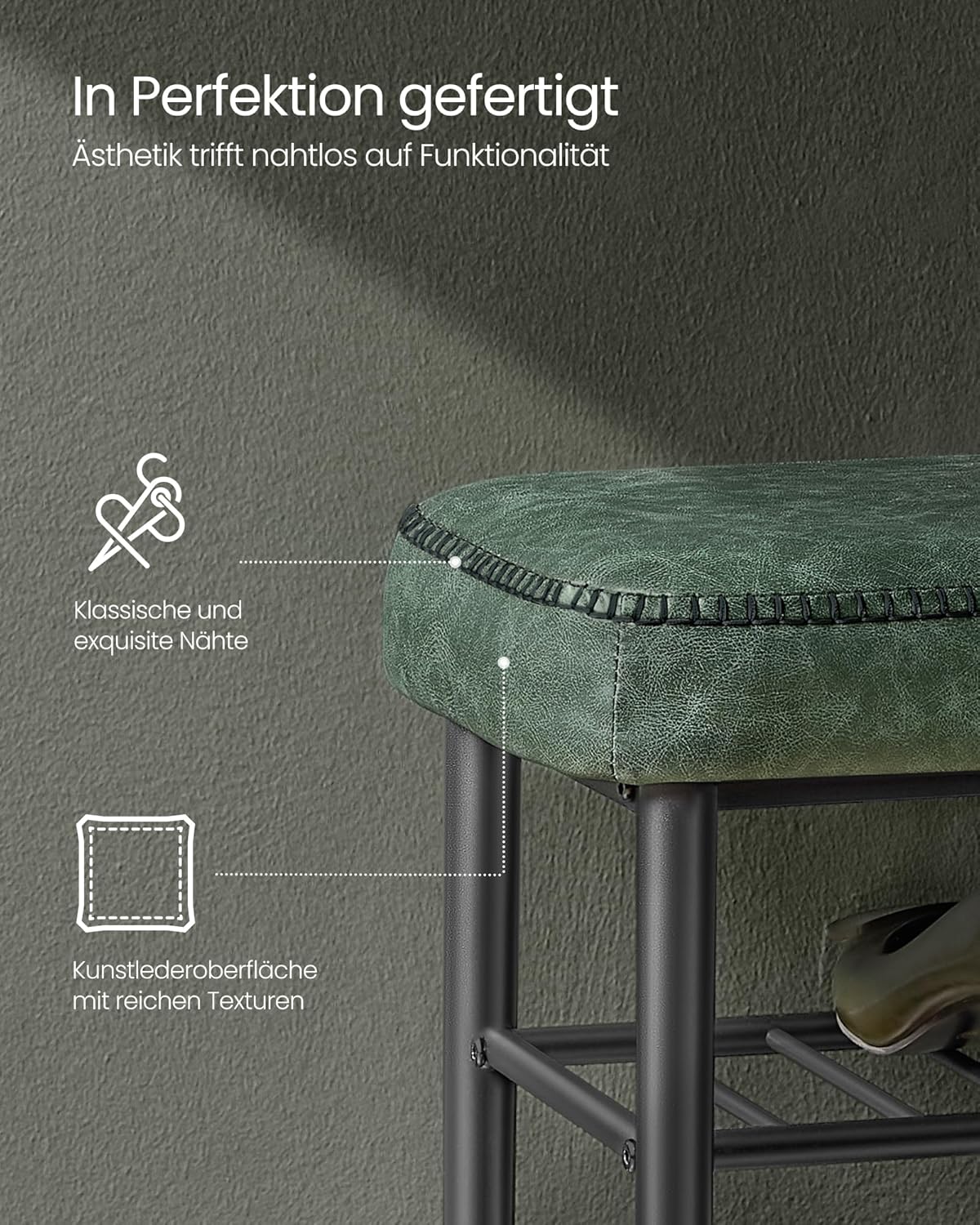 Kunden sind begeistert vom preisgekrönten Design (Bronze A' Design Award 2024), der eleganten Waldgrün-Optik und der hochwertigen Kunstlederpolsterung mit präzisen Nähten. Besonders geschätzt werden der bequeme 6 cm 25D-Schaum, der stabile Stahlrahmen, die praktische 3-Ebenen-Ablage für Schuhe (aufsaugroboterfreundlich), die pflegeleichte Oberfläche sowie die kompakte Bauweise und die einfache, schnelle Montage.