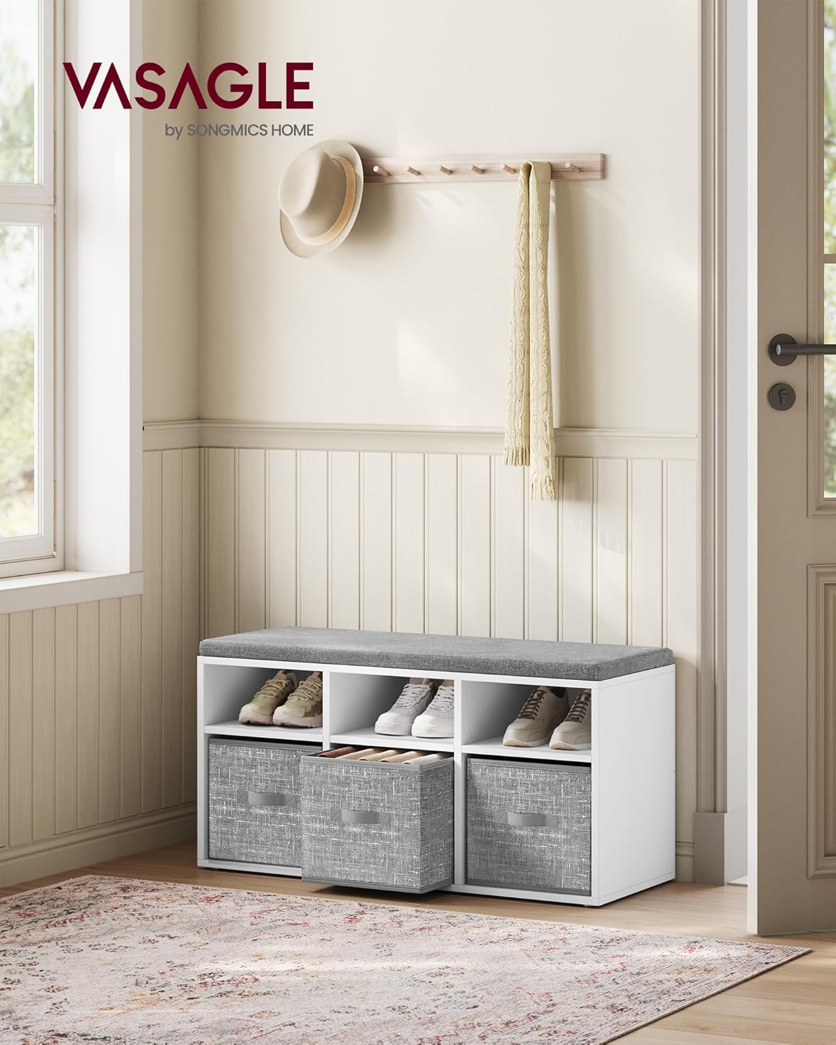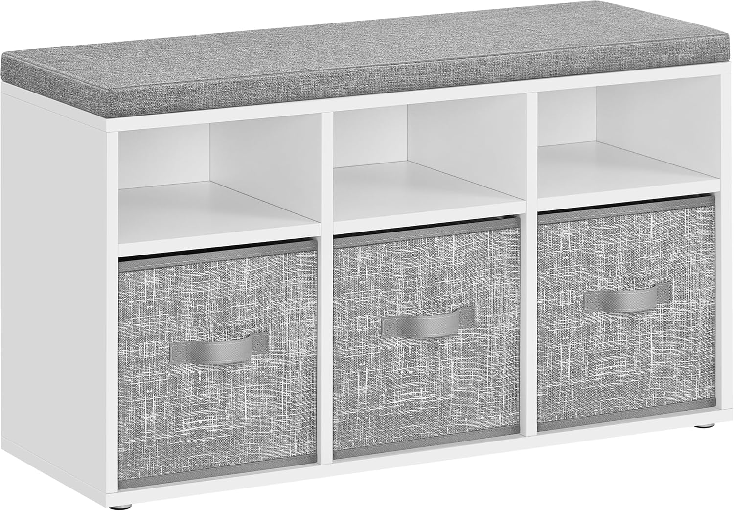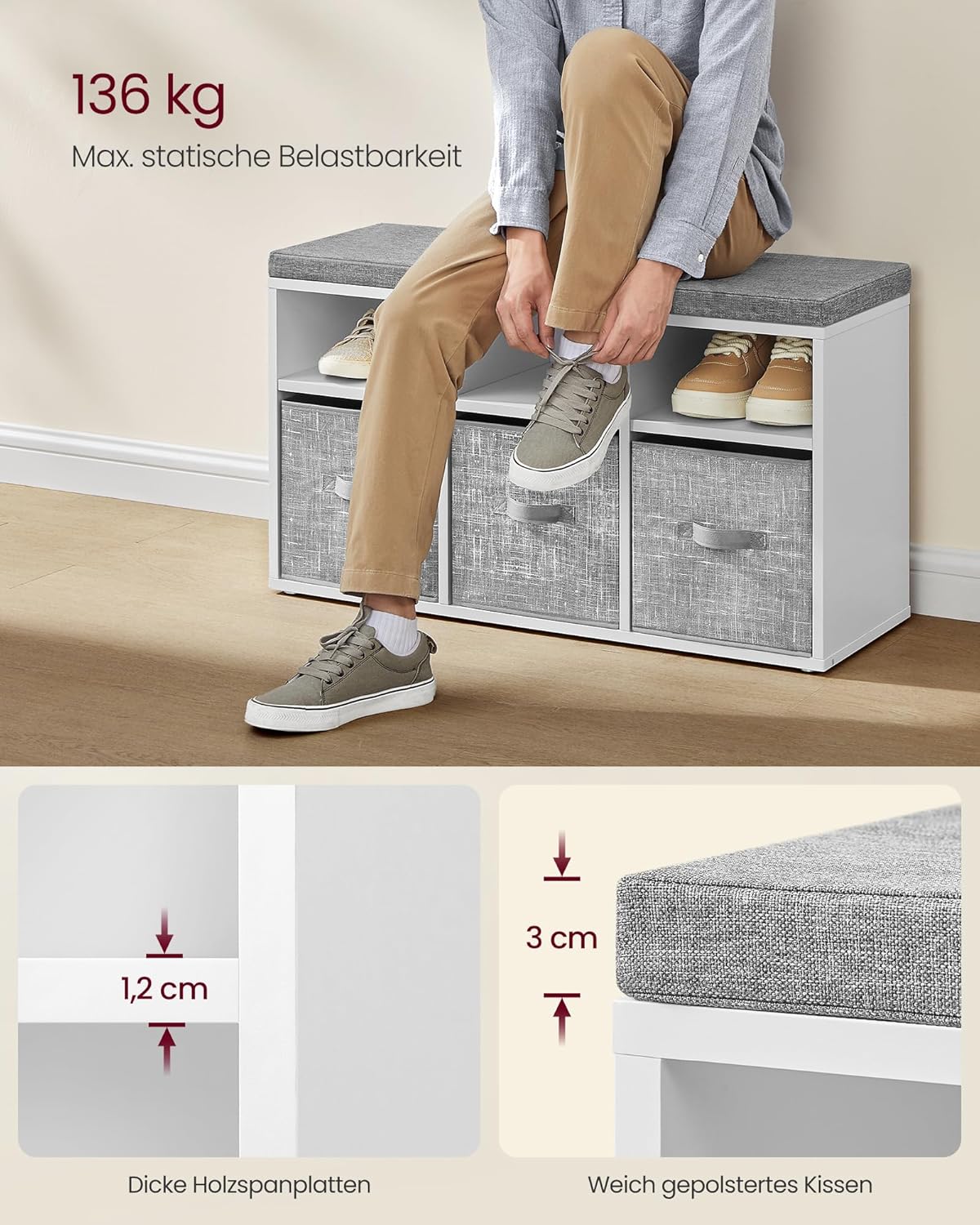 Entdecken Sie die SONGMICS Schuhbank – die perfekte Kombination aus Stil und Funktionalität für Ihr Zuhause! Diese multifunktionale Sitzbank ist nicht nur ein bequemer Platz, um Ihre Schuhe zu wechseln, sondern auch ein praktischer Schuh-Organizer, der Ihren Flur, Ihr Wohnzimmer oder Schlafzimmer aufgeräumt hält. Mit ihren kompakten Massen von 30,3 x 87 x 48 cm passt sie ideal in jeden Raum, ohne dabei viel Platz zu beanspruchen. Die SONGMICS Schuhbank kommt mit 6 Fächern und 3 verstellbaren Ablagen, die sich um 6,4 cm nach oben oder unten anpassen lassen. So können Sie ganz einfach Gegenstände unterschiedlicher Grösse, wie Bücher, Aufbewahrungsboxen oder sogar Ihre Lieblings-High-Heels, verstauen. Geniessen Sie den Komfort eines gut gepolsterten Kissens, das Sie beim Ausziehen Ihrer Schuhe sanft empfängt. Der abnehmbare Kissenbezug ist pflegeleicht und lässt sich mühelos von Hand waschen – für ein stets frisches Zuhause. Der Aufbau der Schuhbank ist kinderleicht! Dank der gekennzeichneten Teile und der klaren Anleitung können Sie im Handumdrehen Platz nehmen und Ihre Schuhe anziehen. Verleihen Sie Ihrem Eingangsbereich mit der stilvollen wolkenweiss-taubengrauen Farbgebung einen modernen Touch und geniessen Sie die Ordnung, die diese Schuhbank in Ihr Zuhause bringt. Holen Sie sich die SONGMICS Schuhbank und erleben Sie, wie Funktionalität und Design harmonisch miteinander verschmelzen!