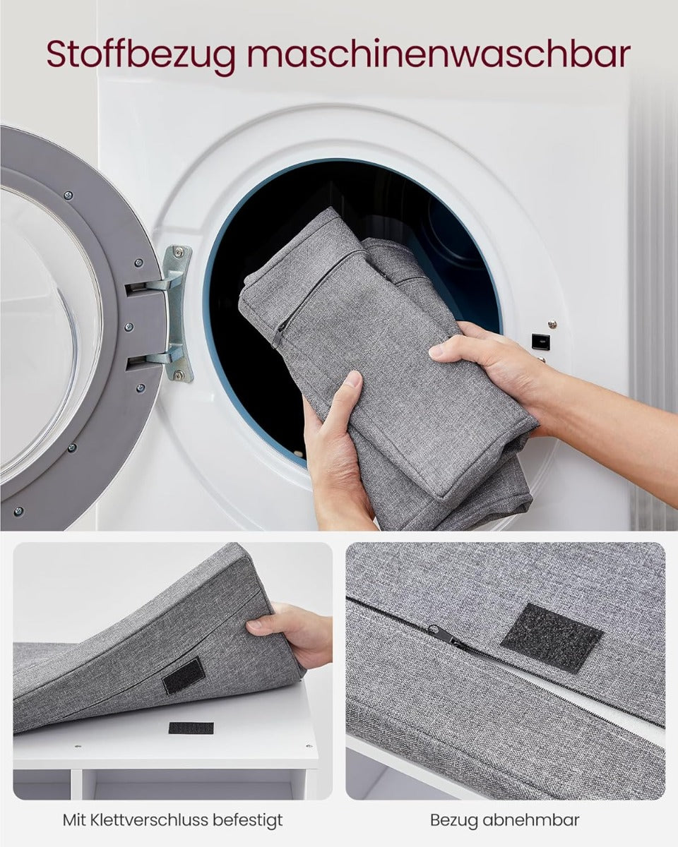 Kompakte Schuhbank mit 12 Fächern für bis zu 12 Paar Schuhe, Verstellbare und herausnehmbare Seitenteile für Stiefel und sperrige Gegenstände, Gepolsterte abnehmbare Sitzfläche mit waschbarem Leinenbezug, bis 136 kg Traglast