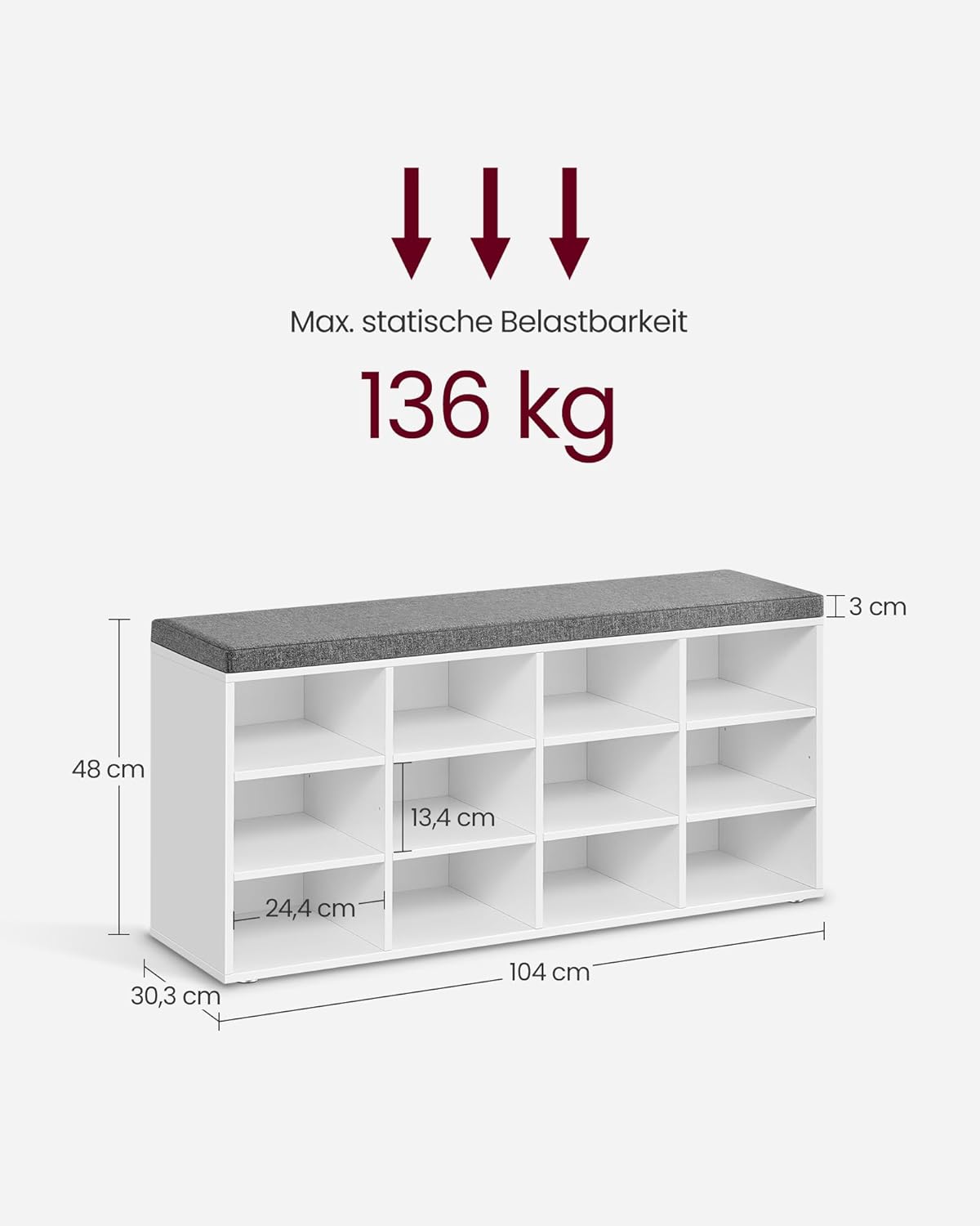 Die VASAGLE Schuhbank LHS012W14 in wolkenweiss und taubengrau vereint durchdachtes Design, hohe Funktionalität und angenehmen Sitzkomfort in einem kompakten Möbelstück und ist damit die perfekte Lösung für Flur, Wohnzimmer oder Schlafzimmer. Mit den Massen 30,3 x 104 x 48 cm (T x B x H) bietet die Bank zwölf grosszügige Fächer von je 29,8 x 24,4 cm, in denen bequem 12 Paar Herrenschuhe untergebracht werden können; die seitlichen Ablagen sind verstellbar und herausnehmbar, sodass auch Stiefel, Schuhkartons oder andere sperrige Gegenstände problemlos Platz finden. Aus robusten 12 mm Spanplatten gefertigt und mit hochwertigen Polsterelementen kombiniert, trägt die Sitzfläche bis zu 136 kg – Sie können sich beim Anziehen entspannt setzen, ohne Wackeln oder Quietschen befürchten zu müssen. Die gepolsterte Sitzfläche verfügt über ein abnehmbares Kissen mit Klettverschlüssen, dessen Bezug in Leinenoptik gefertigt und waschbar ist, sodass Hygiene und frischer Look leicht zu erhalten sind; das verwendete Schaumstoffpolster sorgt für angenehmen Komfort bei jedem Gebrauch. Sechs Fusspads an der Unterseite schützen Ihren Boden zuverlässig vor Kratzern und sorgen für Standfestigkeit. Der Zusammenbau gestaltet sich dank gekennzeichneter Teile und einer leicht verständlichen Anleitung unkompliziert und zeitsparend; im Lieferumfang enthalten sind die Schuhbank, ein Zubehörkit sowie eine Montageanleitung. Mit einem Produktgewicht von 18,3 kg ist die Bank stabil und dennoch transportabel, die Kombination aus weisser Front und taubengrauem Leinenbezug fügt sich dezent-elegant in unterschiedliche Einrichtungsstile ein. Ob als praktisches Schuhregal im Eingangsbereich, als zusätzliche Sitzgelegenheit mit Stauraum im Wohnzimmer oder als stilvolle Bank am Fußende des Bettes – diese VASAGLE Schuhbank bietet langlebige Qualität, flexible Aufbewahrungsmöglichkeiten und komfortables Sitzen in einem ästhetischen, platzsparenden Möbelstück.