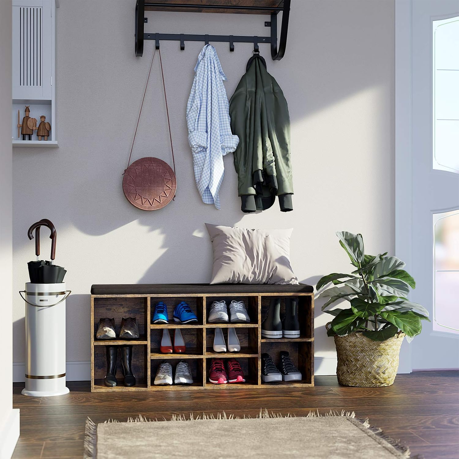 Die VASAGLE Schuhbank LHS10BX bietet zehn offene Fächer plus flexible Seitenablagen und eine bequeme, waschbare Polstersitzfläche – eine robuste, rustikal-braune Lösung, die Flur oder Schlafzimmer stilvoll ordnet und beim Schuheanziehen komfortablen Halt gibt.