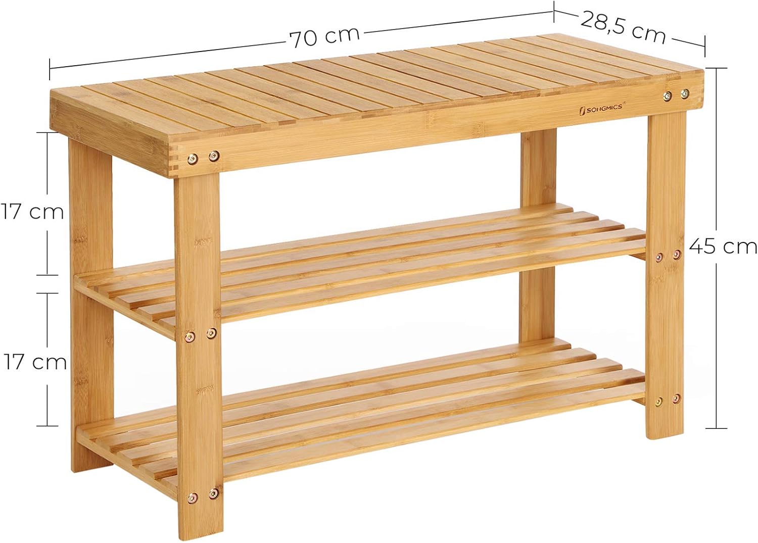 Entdecken Sie das SONGMICS Schuhregal mit Sitzbank – die perfekte Kombination aus Stil und Funktionalität für Ihren Eingangsbereich! Hergestellt aus hochwertigem Bambus, bringt dieses Möbelstück nicht nur eine einladende Wärme in Ihr Zuhause, sondern bietet auch einen praktischen Platz, um nach einem langen Tag die Schuhe auszuziehen und zu entspannen. Mit seinen kompakten Massen von 70 x 28 x 45 cm passt das Schuhregal ideal in Flur, Bad, Wohnzimmer oder Diele. Die zwei stabilen Bambusablagen bieten ausreichend Platz für mindestens 6 Paar Schuhe und sorgen für Ordnung, während die oberste Ablage perfekt ist, um Ihre Arbeitstasche oder Ihr Portemonnaie abzulegen. Dank des robusten Bambusrahmens ist diese Schuhbank nicht nur ein echter Hingucker, sondern auch extrem stabil – sie trägt bis zu 130 kg und bietet Ihnen zuverlässigen Halt. Und das Beste: Die Montage ist kinderleicht! Mit einer einfachen Struktur und einer detaillierten Anleitung ist Ihr neuer Schuhorganizer im Handumdrehen einsatzbereit. Geniessen Sie die Vorteile einer stilvollen Schuhbank, die nicht nur Platz für Ihre Schuhe bietet, sondern auch einen gemütlichen Sitzplatz zum Wechseln der Schuhe. Holen Sie sich das SONGMICS Schuhregal und verwandeln Sie Ihren Eingangsbereich in eine Oase der Ordnung und Gemütlichkeit!