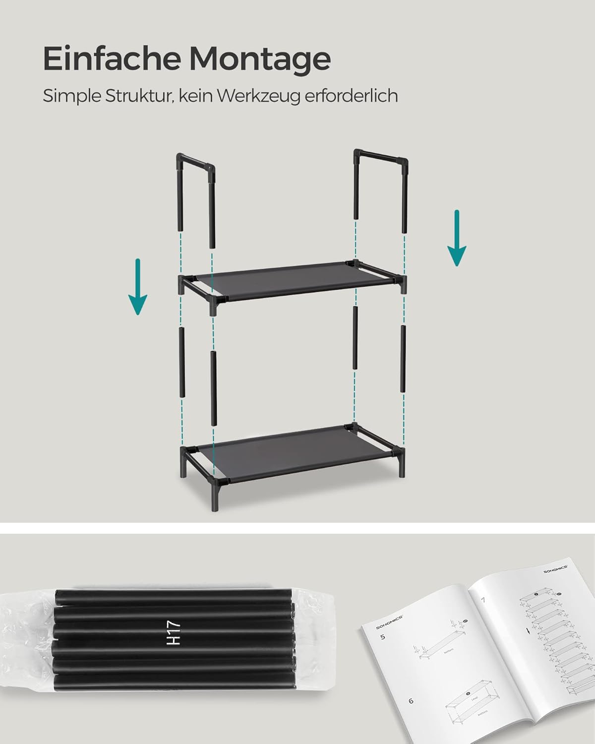 Platz für bis zu 10 Paar Schuhe auf schmaler Stellfläche, Stabiles Metallgestell mit strapazierfähigen Vlies-Ablagen, Einfache Montage und entfernbare Ablage für Stiefel