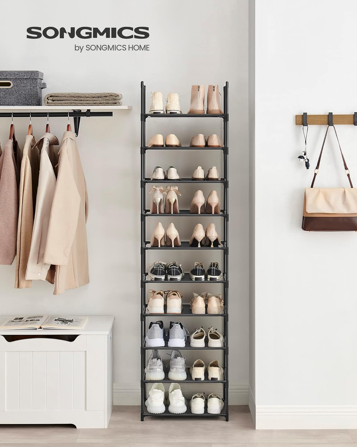 Bringen Sie Ordnung in Ihr Schuhchaos mit dem SONGMICS Schuhregal, das auf 10 Ebenen Platz für all Ihre Lieblingsschuhe bietet und sich mühelos in jeden Raum integriert. Geniessen Sie die Kombination aus robustem Design und einfacher Montage für ein aufgeräumtes Zuhause.