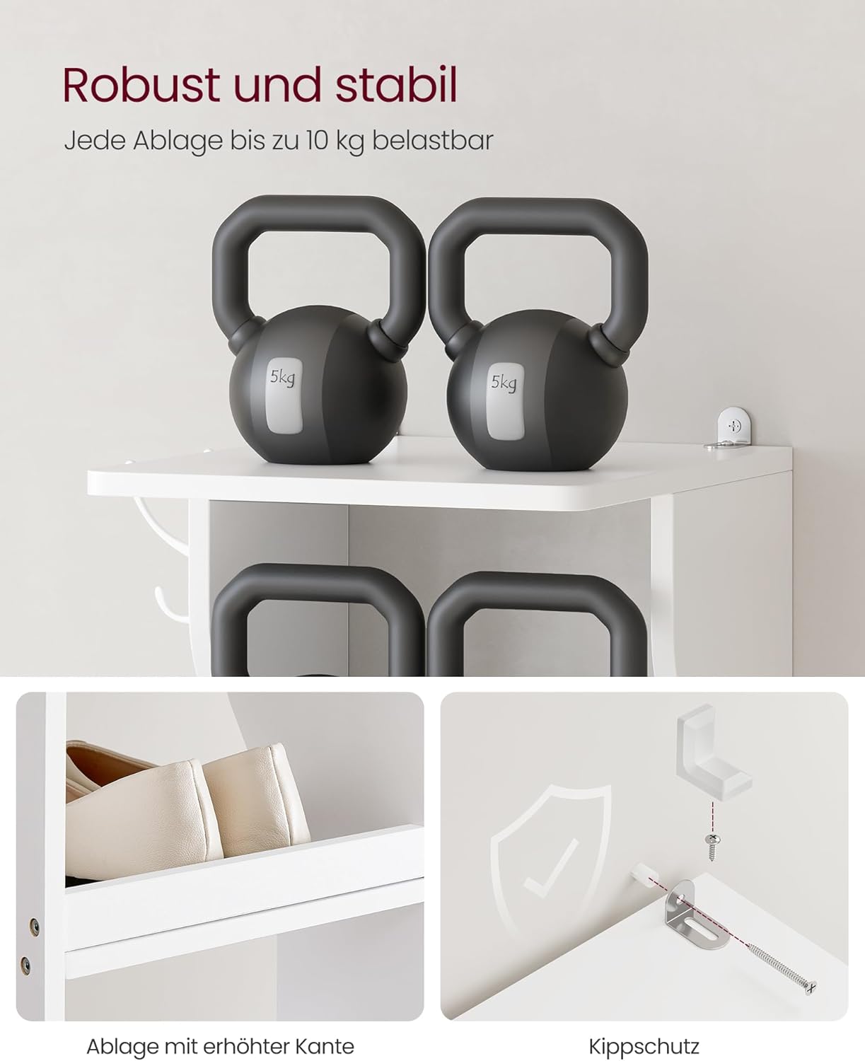 Kunden begeistern vor allem das platzsparende, elegante Design und die 7 Ablagen, die Ordnung auch in engen Fluren schaffen. Gelobt werden die variablen Haken, 17 cm Abstand für größere Schuhe, belastbare 10‑kg‑Böden, erhöhte Kanten und Kippschutz – praktisch, stabil und vielseitig einsetzbar.
