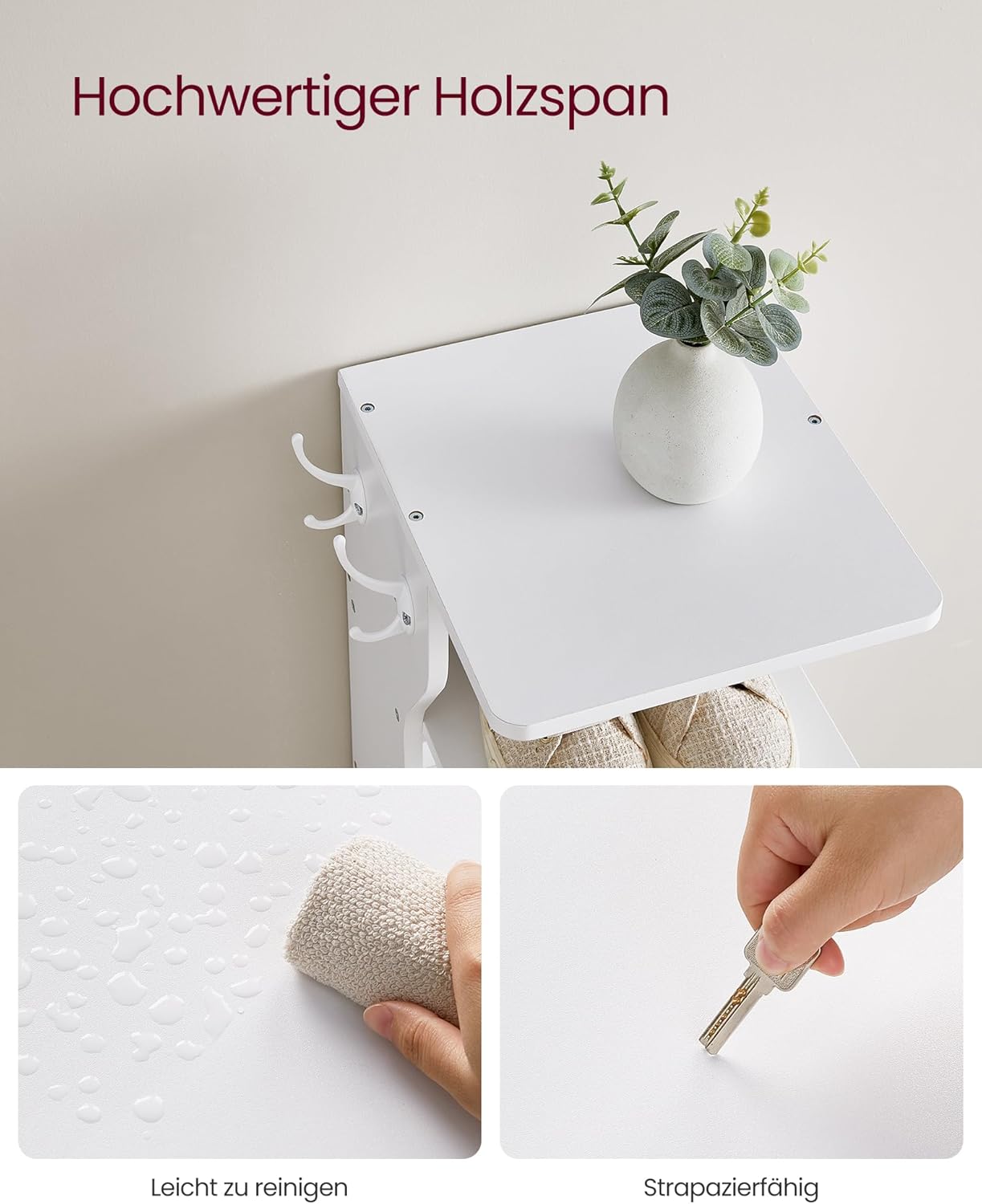 Platzsparendes Schuhregal mit 7 Ebenen für Schuhe und Deko, Flexible Haken für Schlüssel und Geldbörse, links/rechts montierbar, Robuste Ablagen bis 10 kg mit Kippschutz und erhöhten Kanten