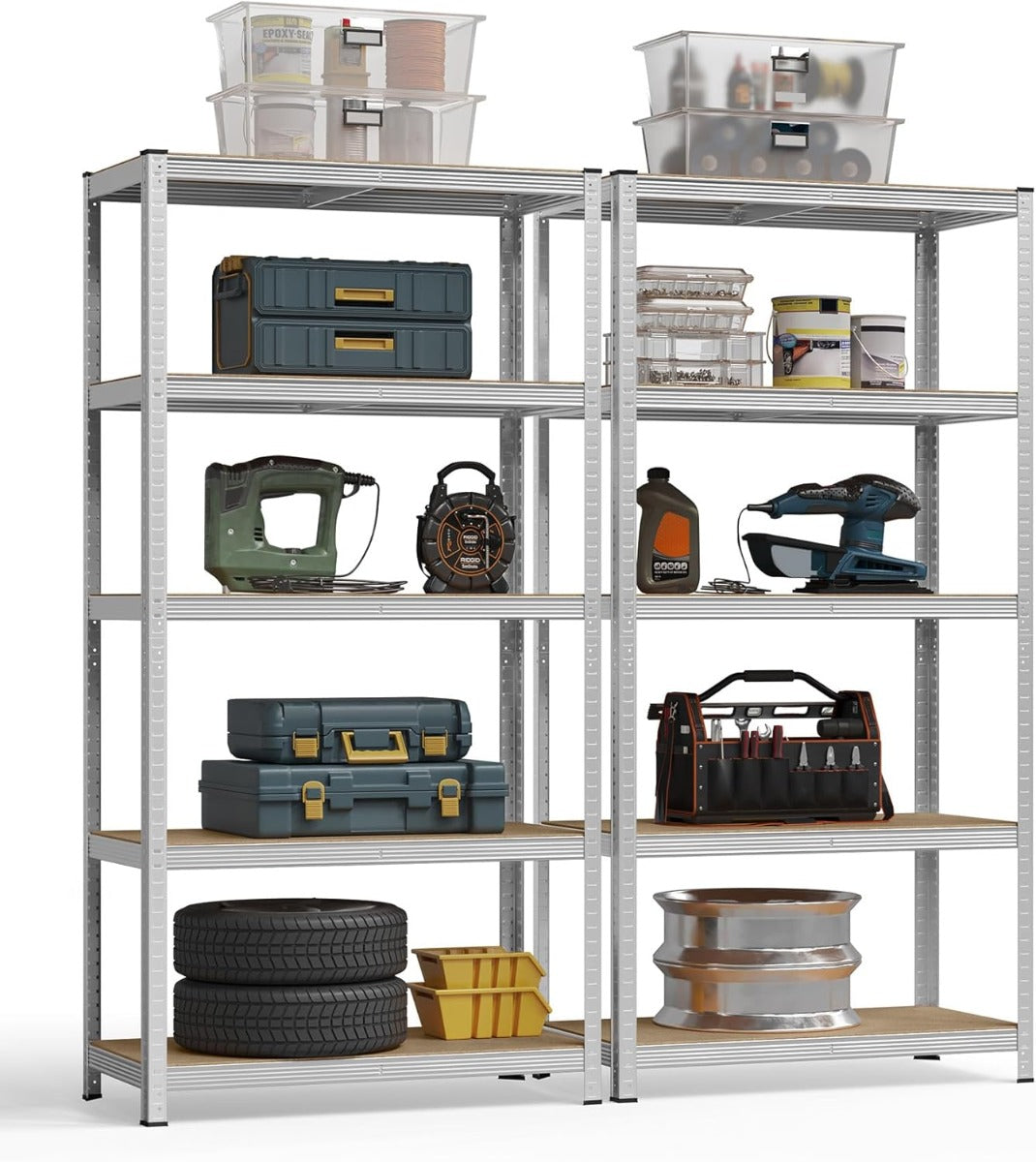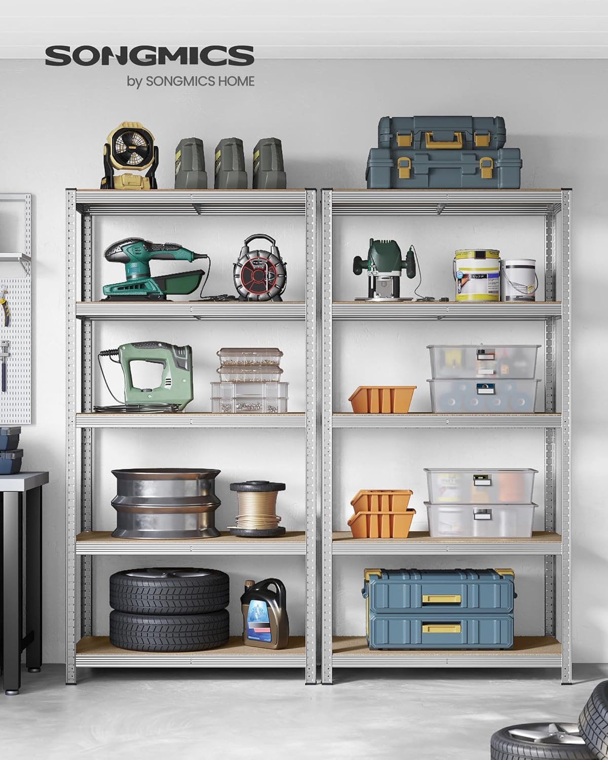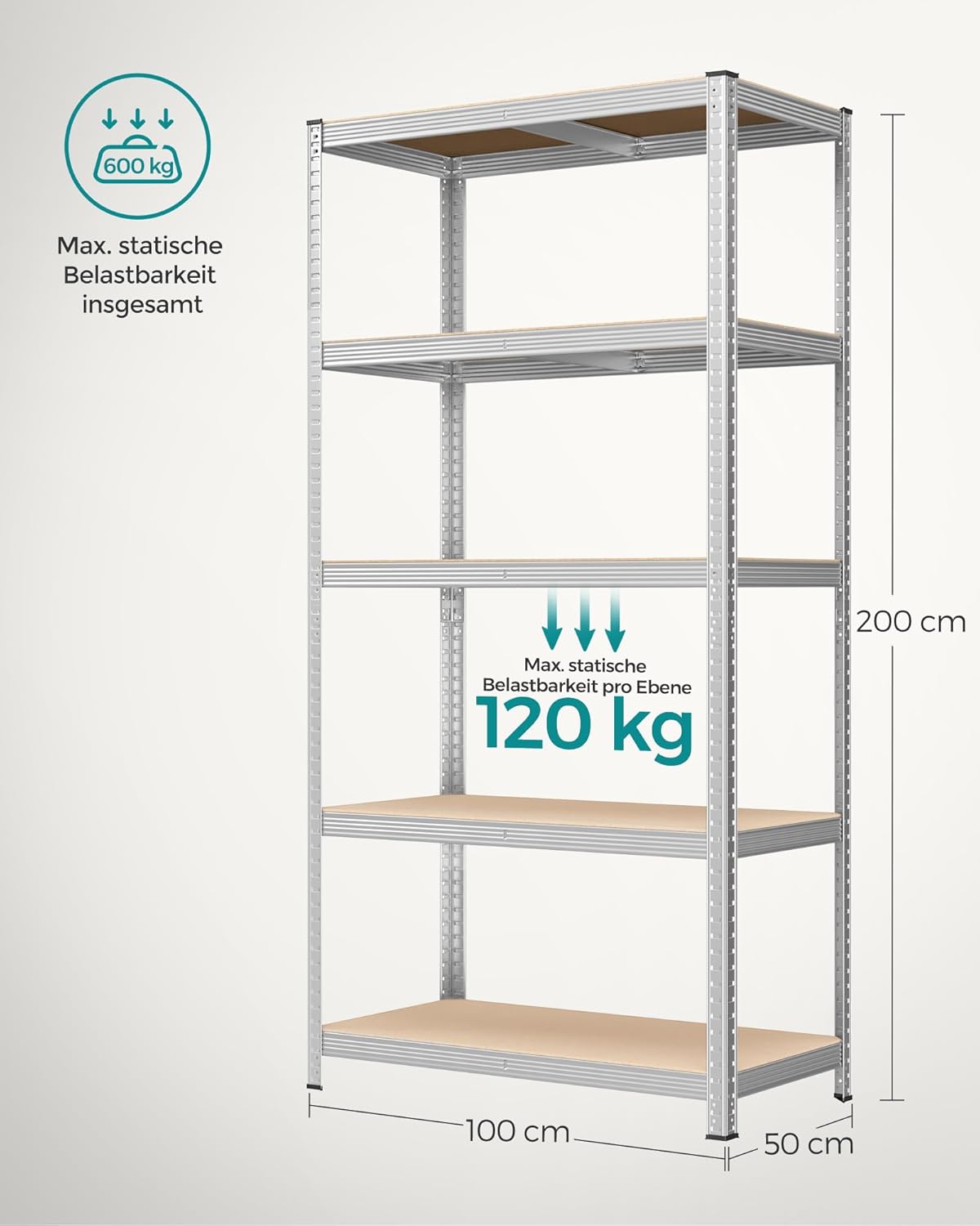 Das SONGMICS Schwerlastregal in Silber bietet maximale Stabilität und flexiblen Stauraum: fünf verstellbare Ebenen, robuste MDF-Ablagen und ein Stahlrahmen tragen bis zu 600 kg. Teilbar in zwei Einzelregale und mit Anti-Kipp-Kit ausgestattet, ist es die ideale Lösung für Garage, Keller oder Werkstatt.