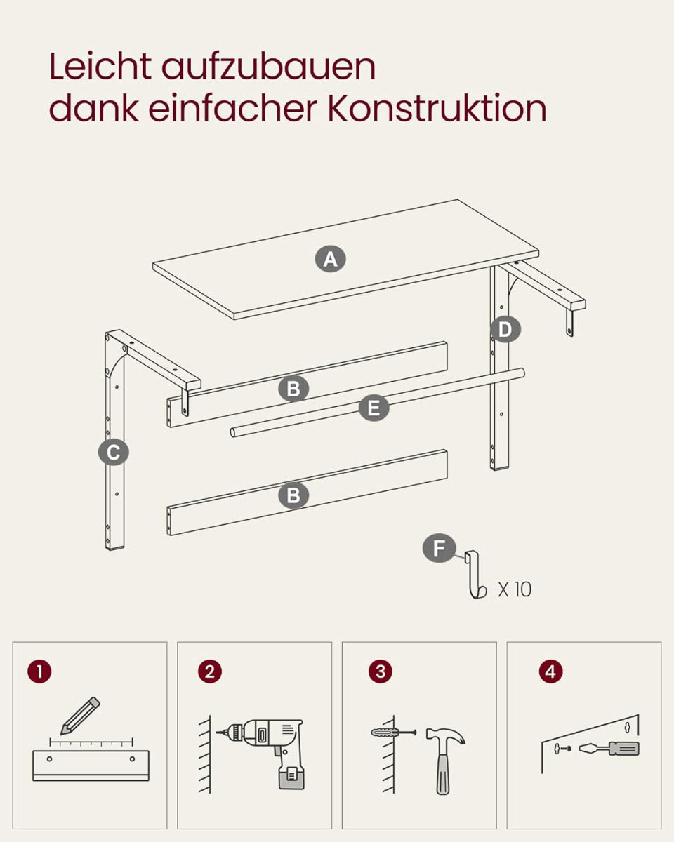 Entdecken Sie die SONGMICS Wandgarderobe – die perfekte Lösung für stilvolle und funktionale Aufbewahrung in Ihrem Zuhause! Mit ihrem einzigartigen 3-in-1-Design vereint dieses Wandregal eine Ablage, eine Kleiderstange und 10 abnehmbare Haken, um Ihre Kleidung und Accessoires ordentlich und griffbereit zu halten. Egal, ob im Flur, Schlafzimmer oder Badezimmer – diese Garderobe passt sich Ihren Bedürfnissen an. Die 10 abnehmbaren Haken in praktischen Doppelreihen ermöglichen es Ihnen, den Abstand individuell anzupassen, sodass Sie Platz für alles von Taschen bis hin zu Jacken schaffen können. Mit einer hohen Belastbarkeit von 8,4 kg für die Ablage, 2,3 kg pro Haken und 10 kg für die Stange ist diese Wandgarderobe nicht nur stilvoll, sondern auch äusserst robust. Das ansprechende Industrial Design in Vintagebraun verleiht Ihrem Raum einen modernen Touch und sorgt gleichzeitig für zusätzlichen Stauraum. Mit den kompakten Massen von 30 x 80 x 42 cm (T x B x H) ist sie die ideale Wahl für kleine und grosse Räume. Die Montage ist kinderleicht! Dank der gekennzeichneten Teile und klaren Anweisungen können Sie die Wandgarderobe schnell und ohne Schwierigkeiten zusammenbauen. Bringen Sie Ordnung in Ihr Zuhause und setzen Sie gleichzeitig einen stilvollen Akzent mit der SONGMICS Wandgarderobe!