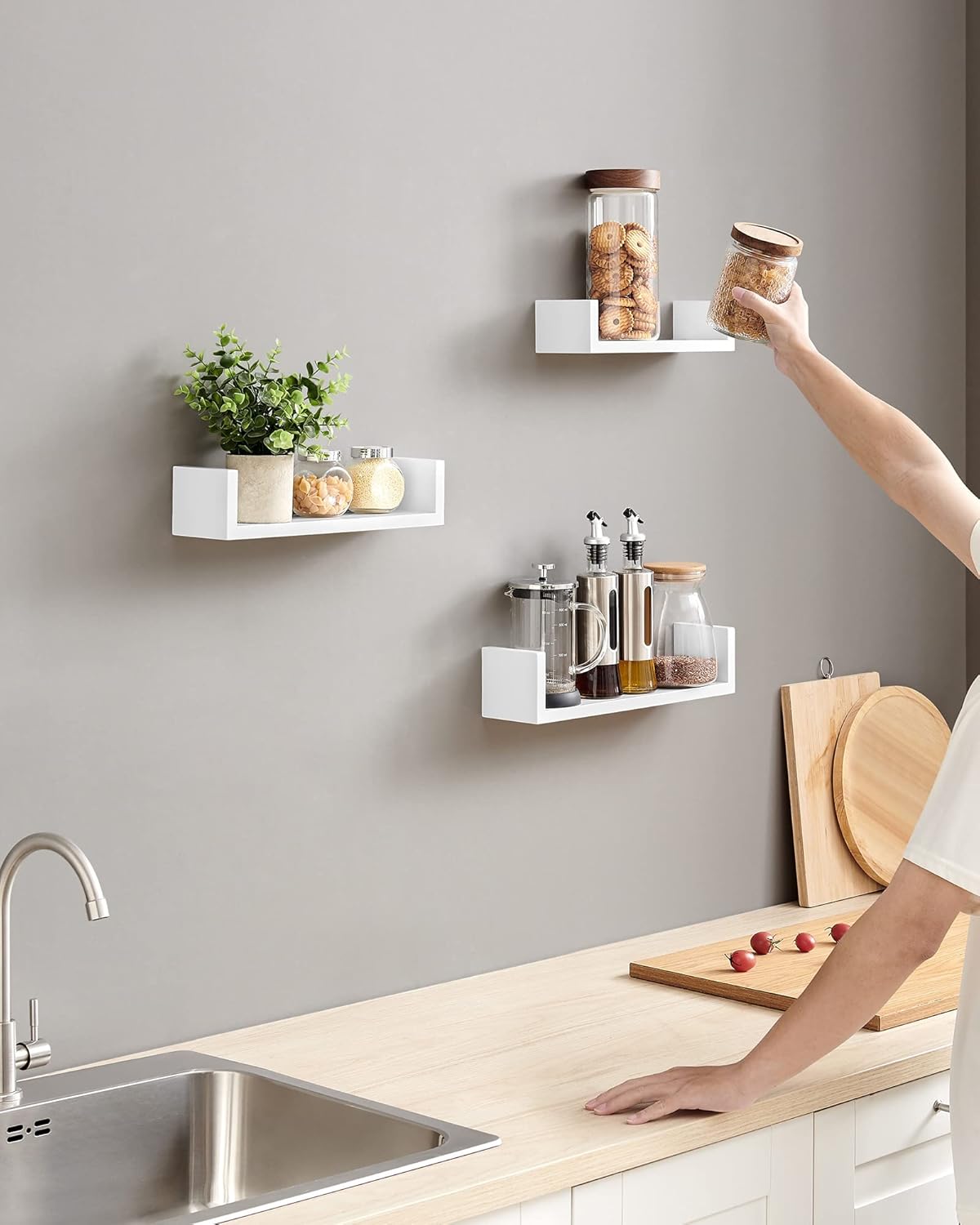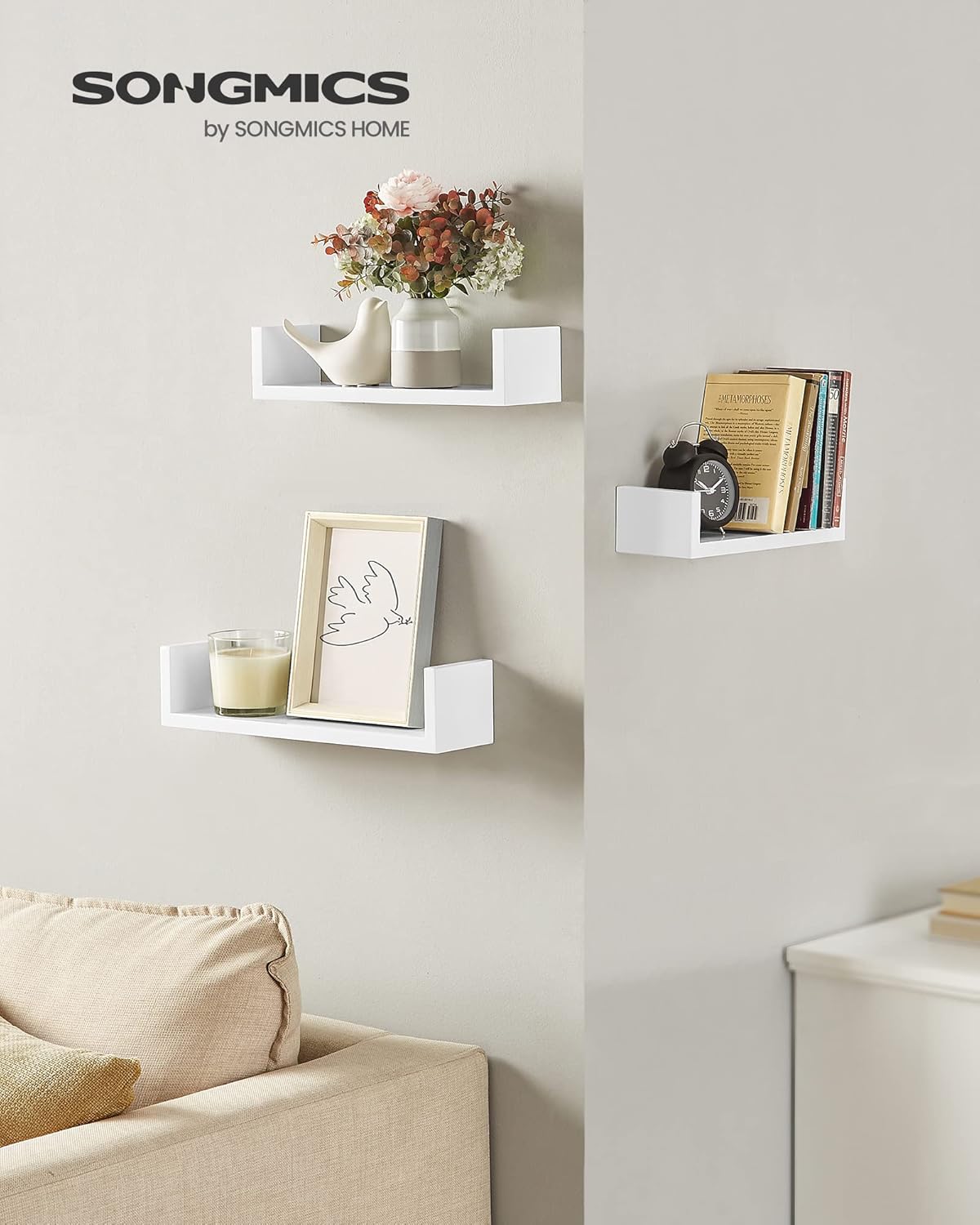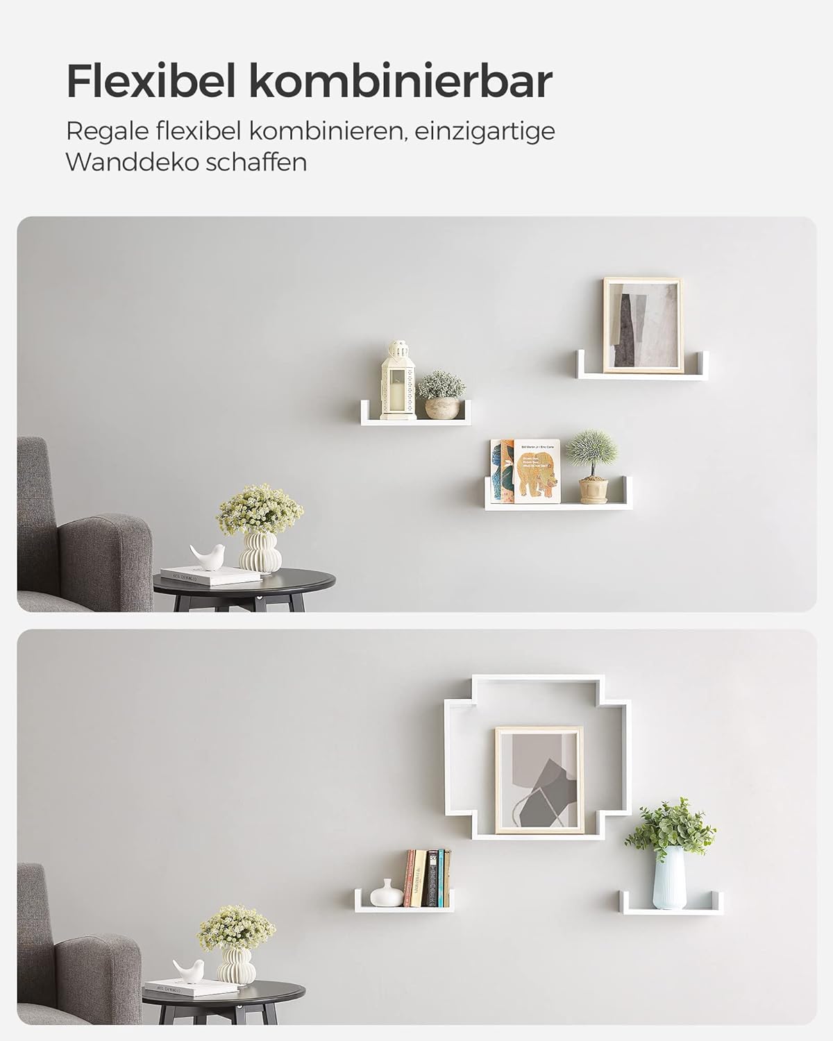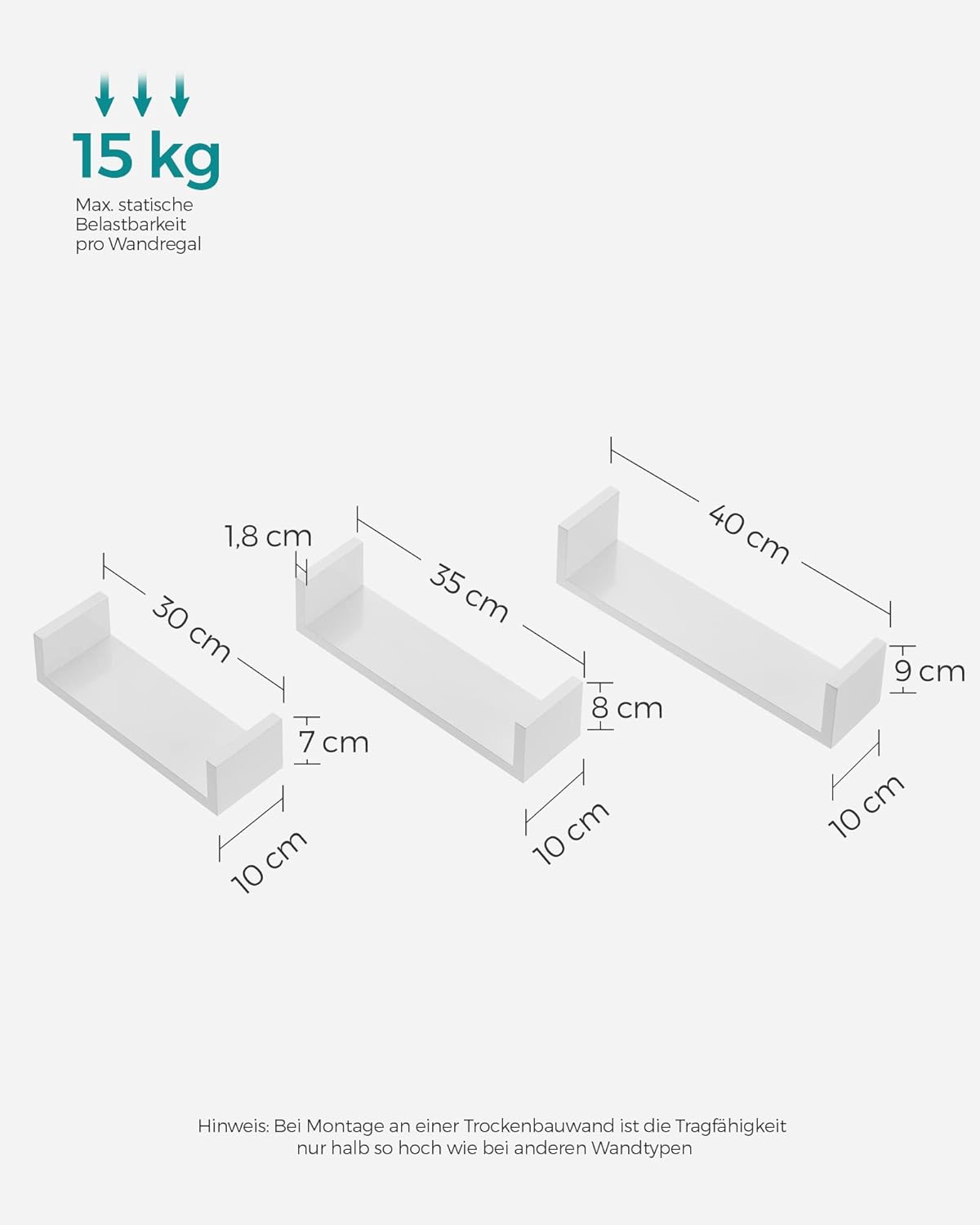 Entdecken Sie das SONGMICS Wandregal-Set – die perfekte Lösung für stilvolle Ordnung in Ihrem Zuhause! Dieses 3er Set von Schweberegalen in hochglanzweiss bringt nicht nur Eleganz in Ihre Räume, sondern bietet auch praktische Möglichkeiten zur Aufbewahrung. Mit den Massen 30, 35 und 40 cm lassen sich die Regale flexibel kombinieren und verleihen Ihren Wänden Charakter und Stil. Die hochwertigen Spanplatten sorgen für Robustheit und Langlebigkeit, sodass jedes Regal bis zu 10 kg belastbar ist. Ob im Wohnzimmer, Arbeitszimmer, Badezimmer oder in der Küche – Ihre Bücher, CDs und Dekorationen finden hier einen sicheren Platz. Die clever gestalteten Seitenwände schützen Ihre Schätze vor dem Herunterfallen und schaffen eine sichere Umgebung. Die Montage ist kinderleicht! Mit der beiliegenden bebilderten Anleitung und den passenden Schrauben können Sie die Regale im Handumdrehen anbringen. Geniessen Sie den zusätzlichen Stauraum, ohne wertvolle Bodenfläche zu beanspruchen. Setzen Sie auf das SONGMICS Wandregal-Set und bringen Sie Ordnung mit Stil in Ihr Zuhause!