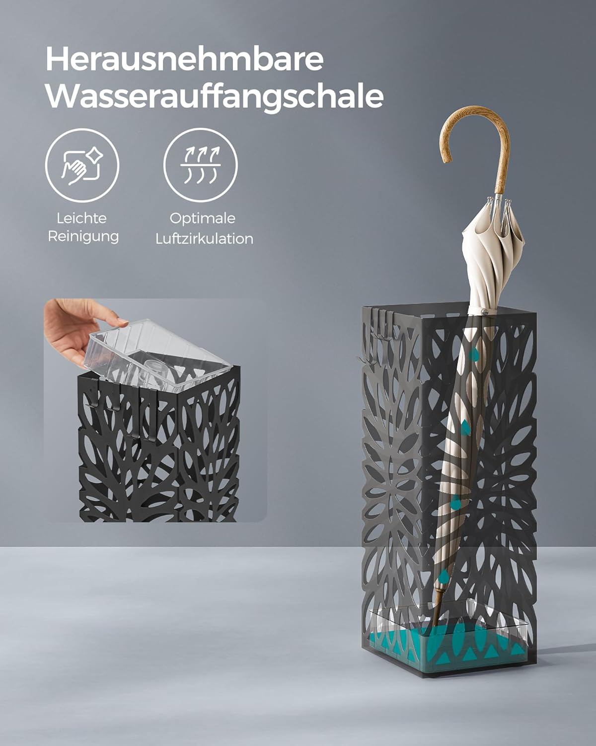 Erleben Sie mit dem SONGMICS Regenschirmständer die perfekte Verbindung von Stil und Funktionalität, die Ihr Zuhause aufwertet und gleichzeitig für Ordnung sorgt. Schützen Sie Ihre Böden und geniessen Sie die Vielseitigkeit dieses eleganten Designs, das in jedem Raum glänzt.