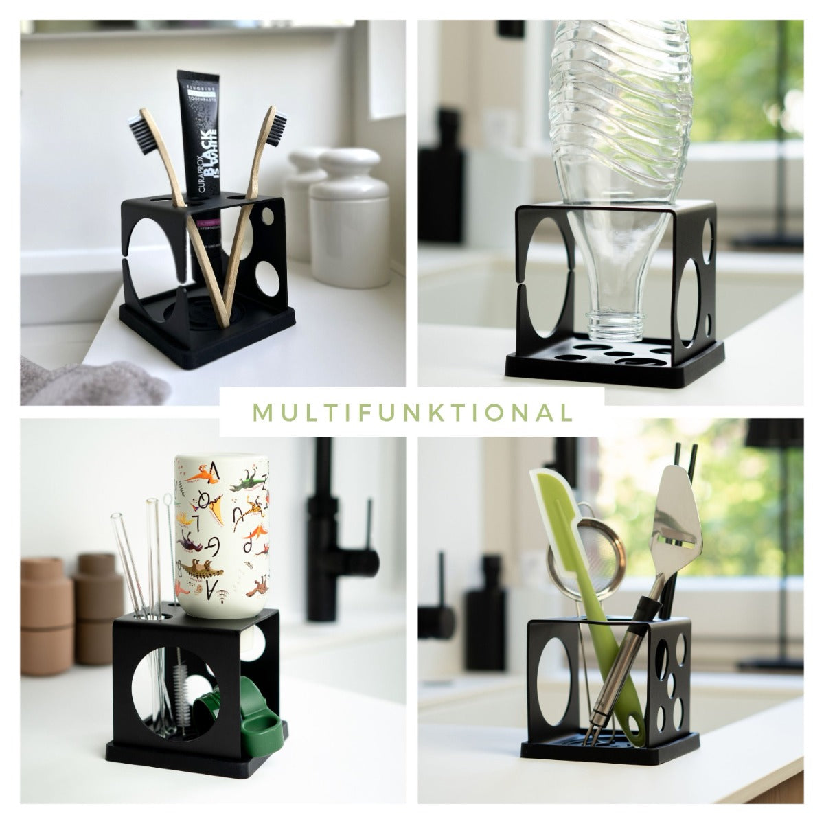 All-in-One Flaschenhalter - platzsparendes Abtropfgestell für Flaschen und Küchen-Utensilien mit Abtropfmatte aus schwarz pulverbeschichtetem Edelstahl und schwarzer Matte aus Platin-Silikon.