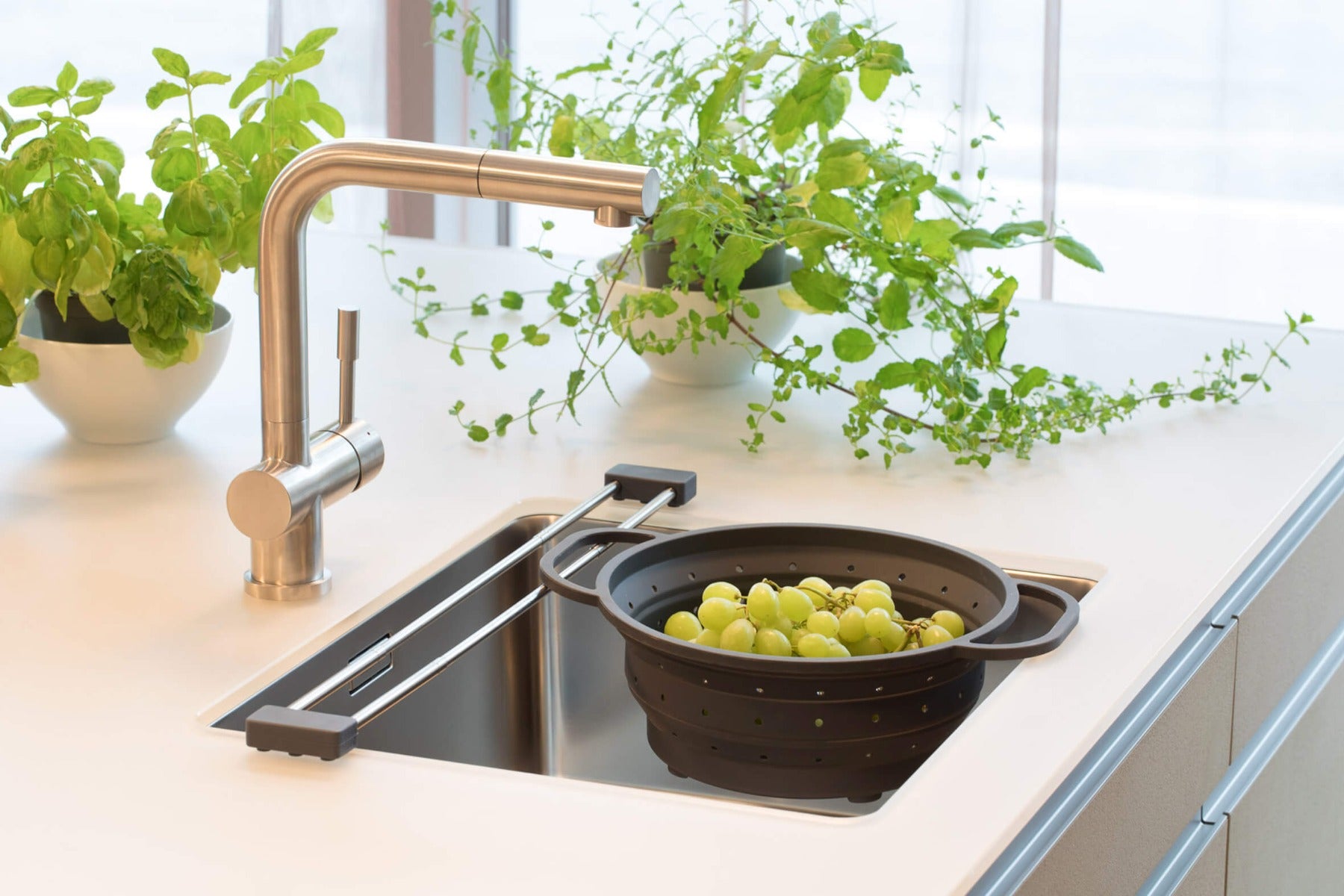sieb.up ist ein hochwertiges Sieb aus hitzebeständigem Silikon und einem Edelstahl-Korpus. Man kann damit kochen, dämpfen, auftauen und abseihen, denn es verträgt Temperaturen von minus 20 bis plus 220 Grad C. sieb.up kann mit einem Handgriff von 10,5 cm auf nur 3 cm zusammengefaltet werden, um platzsparend in der Küchenlade verstaut oder im Geschirrspüler gewaschen zu werden.