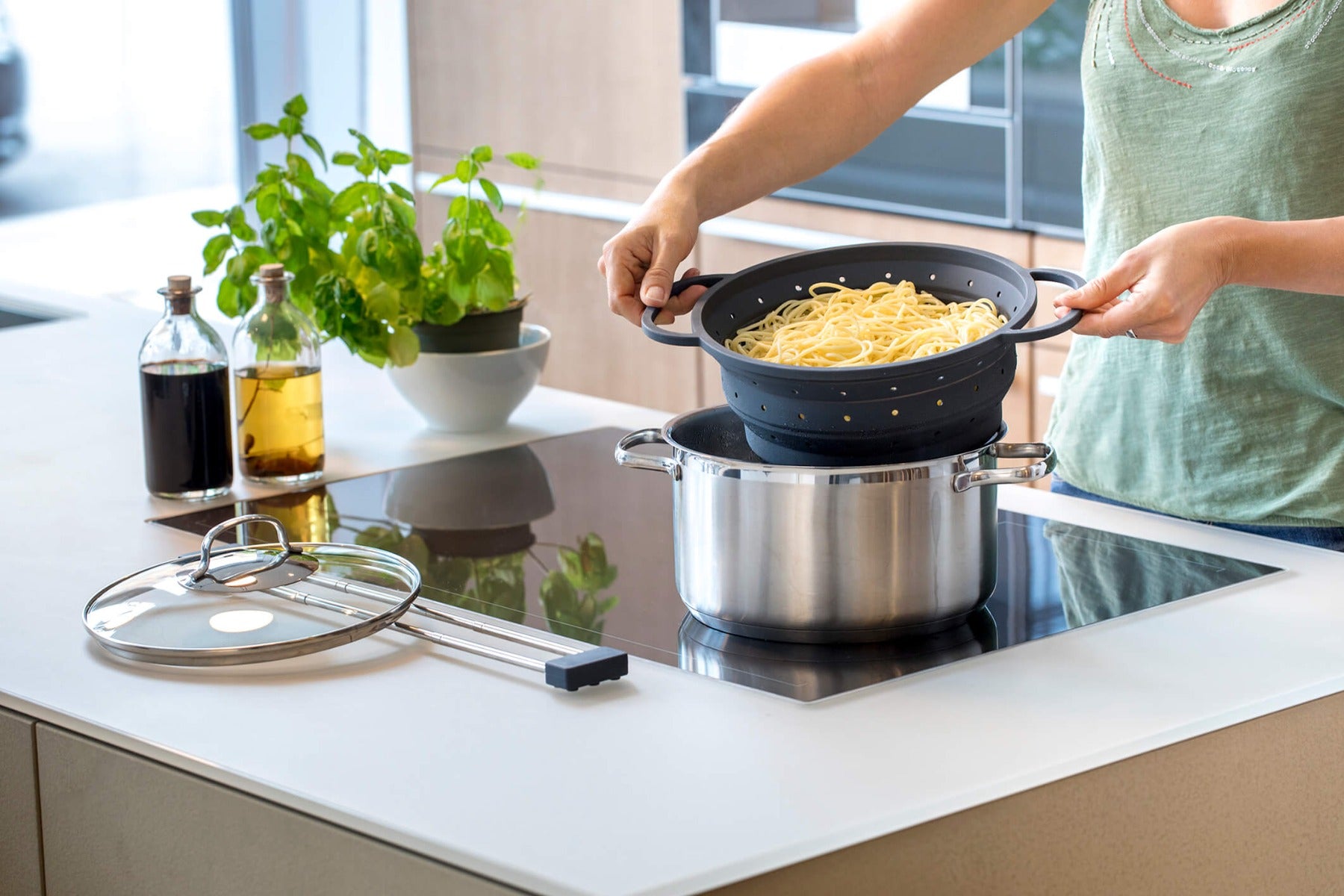 Hitzebeständig von minus 20 bis plus 220 Grad C, vielseitig einsetzbar zum Kochen, Dämpfen und Abseihen, platzsparend zusammenfaltbar auf nur 3 cm