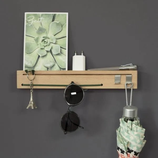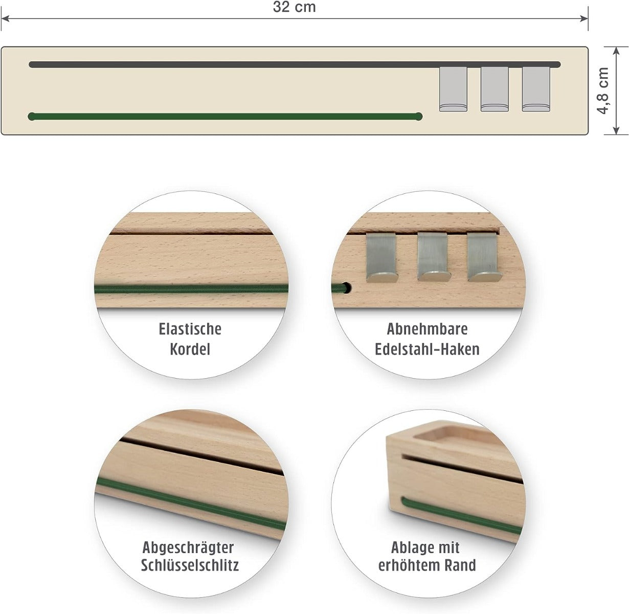 Das Schlüsselbrett mon.key von Sanni Shoo überzeugt mit grossem Nutzen auf kleinem Raum. Mit den Massen 32 x 4,8 x 5 cm erfüllt es mehrere Funktionen: SCHLÜSSELHALTER UND INNOVATIVER SCHLÜSSELSCHLITZ Die Schlüsselleiste mon.key hat über die gesamte Länge (32 cm) einen Schlüsselschlitz, der (anders als andere Schlüsselboards) schräg eingearbeitet ist. Schlüssel können daher nicht herausfallen. BRILLENHALTER Suchen Sie auch öfters nach der Brille oder Sonnenbrille? Auf mon.key erhält sie endlich einen sicheren und fixen Platz. Die eingearbeitete elastische Kordel fungiert als Billen-Halterung, und ist in 3 stylischen Farben erhältlich. ABLAGE UND AUFBEWAHRUNG Schnell das Handy ablegen beim Gehen? Ein sicherer Platz für die AirPods oder andere Kopfhörer gesucht? Münzen schnell zur Hand? Mit erhöhtem Rand fungiert unsere Holzleiste perfekt als Ablage an der Wand. VOLLE FLEXIBILITÄT: EINFACHE MONTAGE UND ABNEHMNBAREN HAKEN Je nach Einsatz hält das Schlüsselbrett mon-key.me Haken aus Edelstahl bereit: Diese können für Schlüssel verwendet werden, aber auch für Dinge wie Regen-Knirps oder Hundeleine. Genauso einfach wie die Montage: Die Schlüsselleiste wird mit Bohrvorlage und 2 passenden Schrauben und Dübel geliefert.